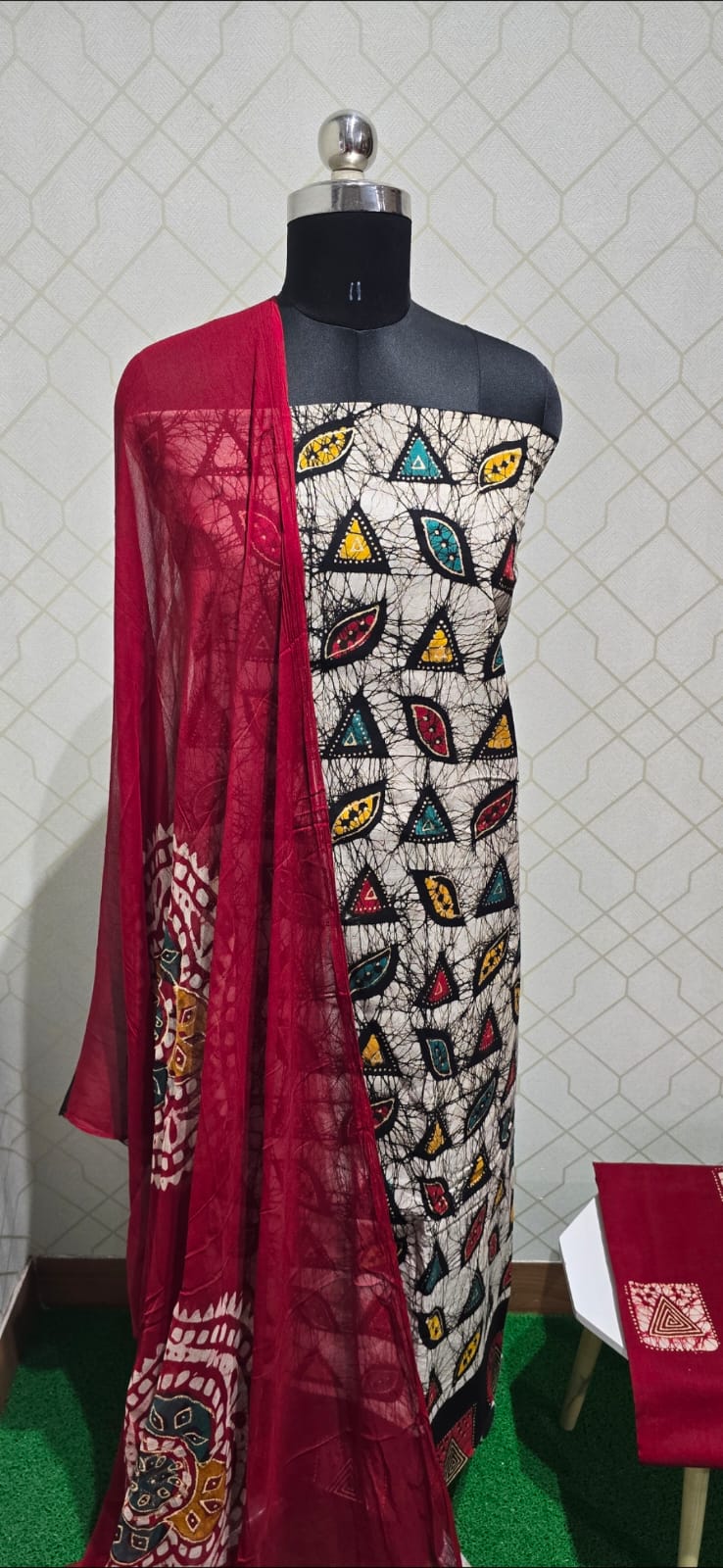 Premium quality bathik dyed cotton top, cotton bottom, bathik dyed georgette dupatta dupatta.
