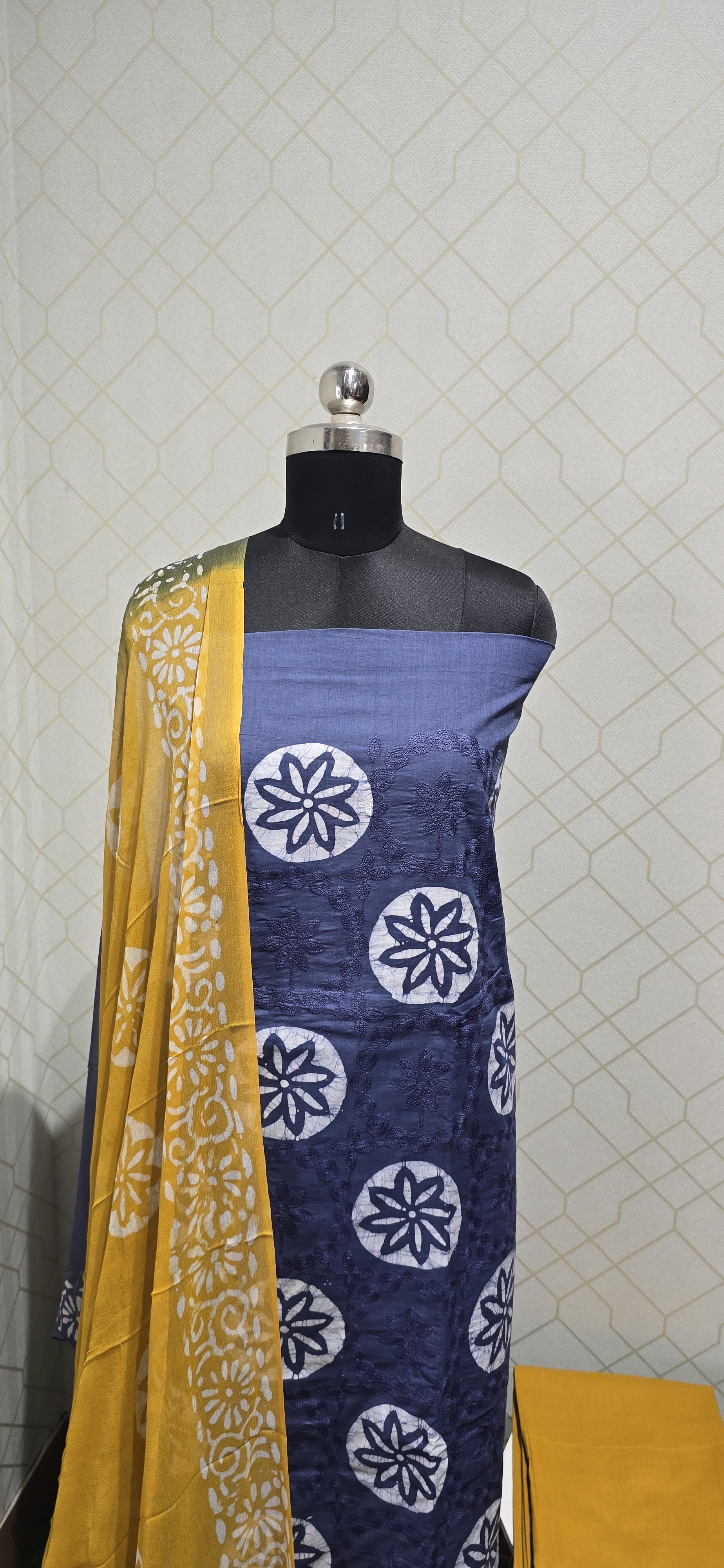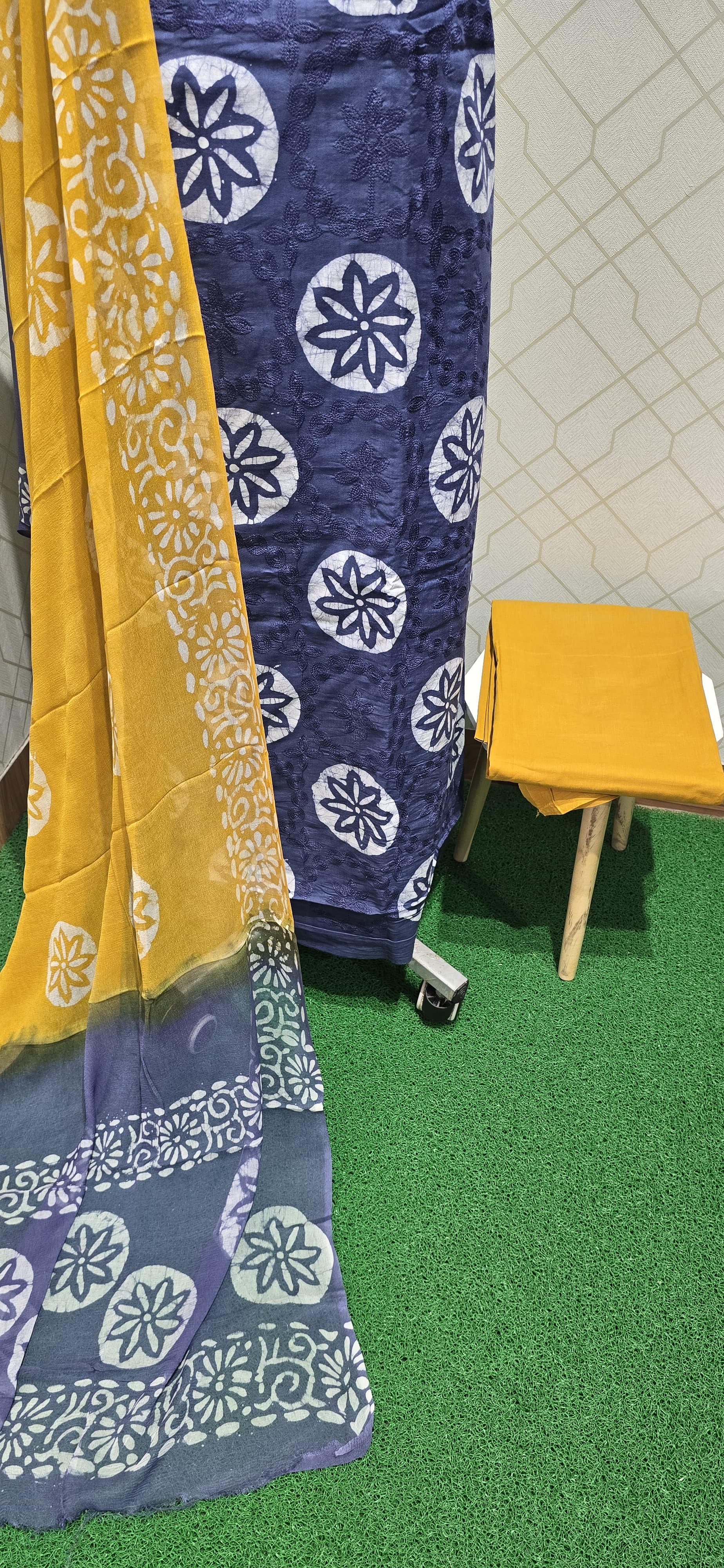 Premium quality bathik dyed cotton top with embroidery work, back side same bathik prints, cotton bottom, bathik dyed georgette dupatta dupatta.