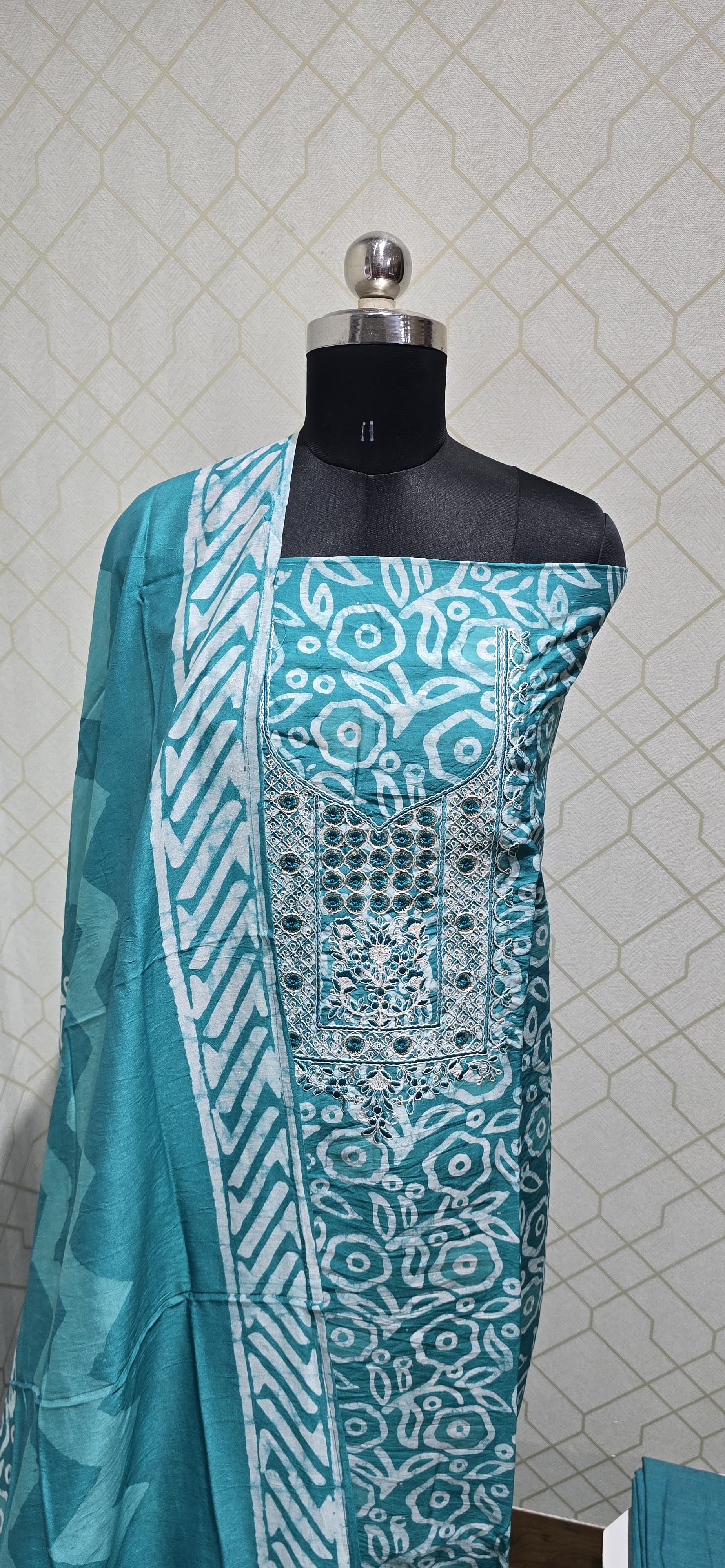 Both side bathik dyed silk cotton top withngrand neck work, bathik dyed cotton bottom, bathik dyed silk dupatta.