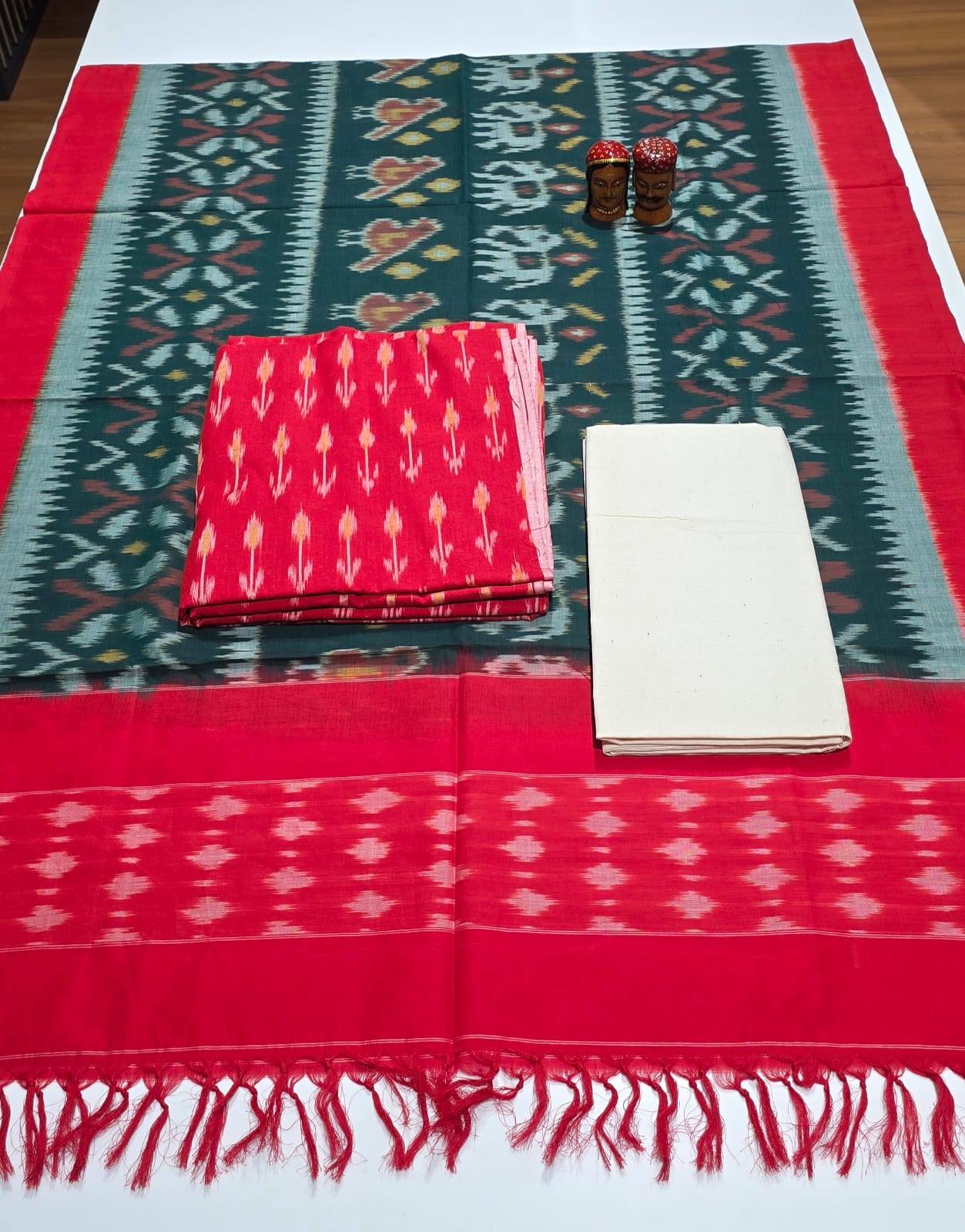 2.5 mtrs premium double side weaved pure Ikkat cotton top, 2 mtr pure cotton bottom, handmade artician worked 2.5 mtrs mercidized pure Ikkat Cotton dupatta with borders and tassels..