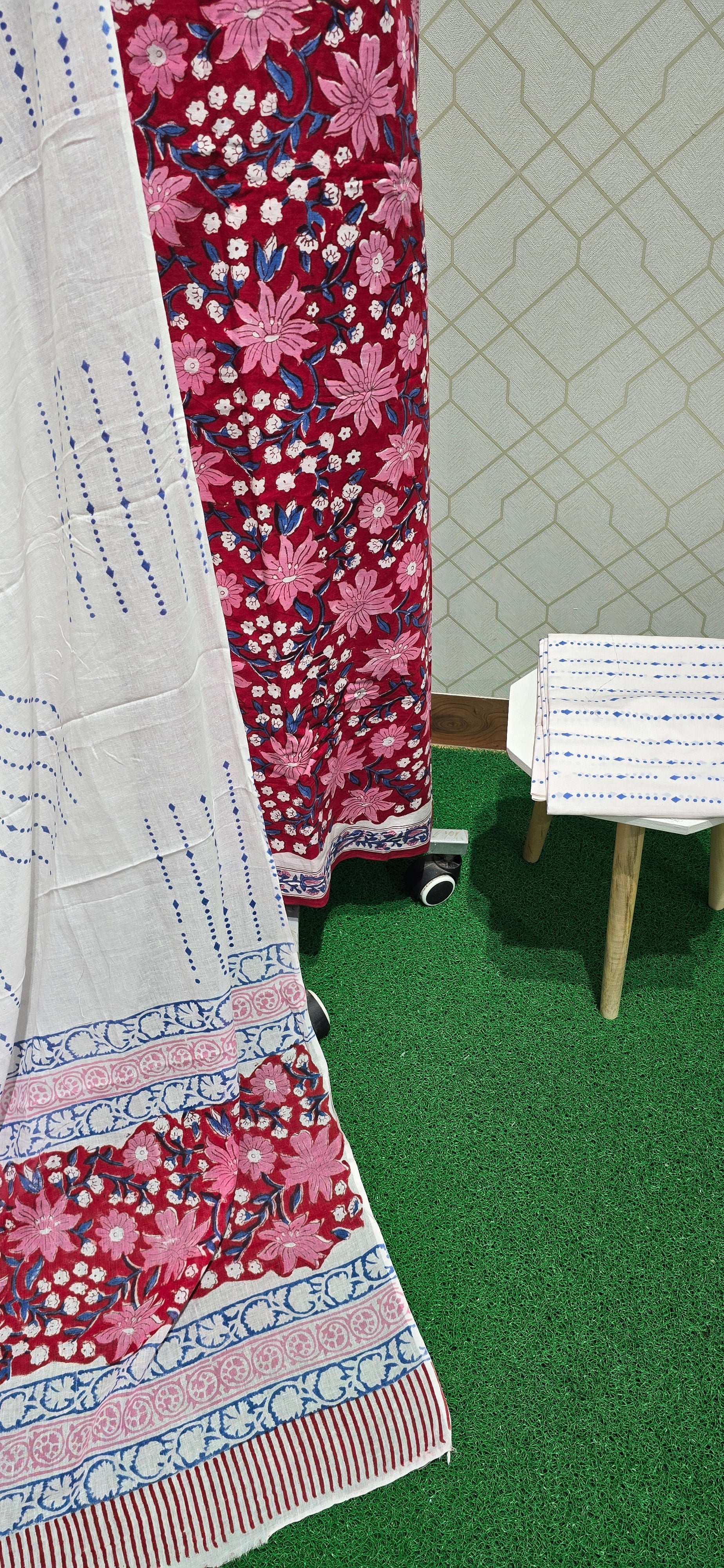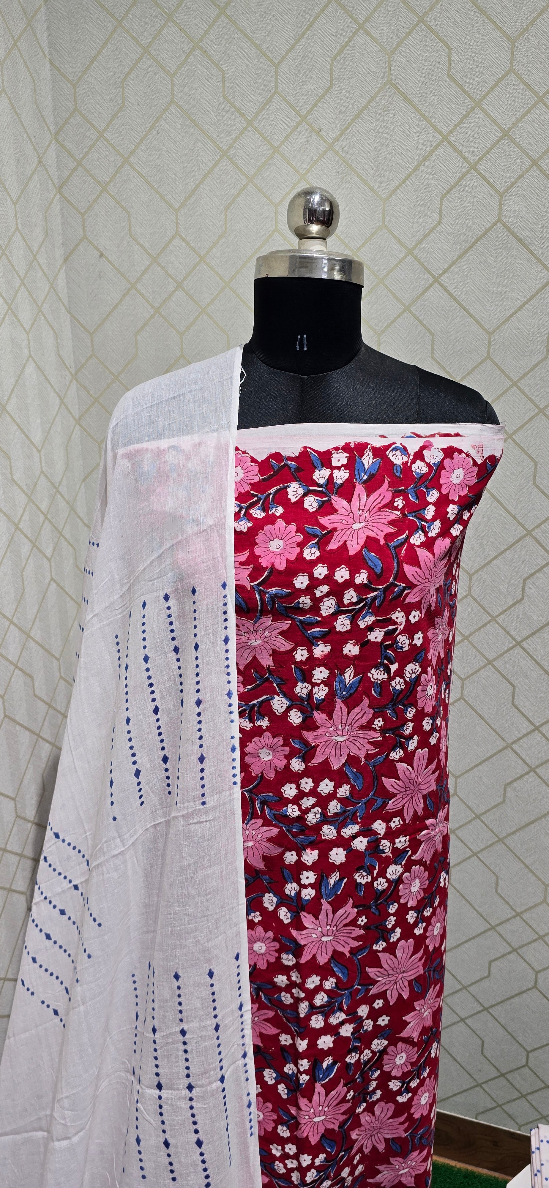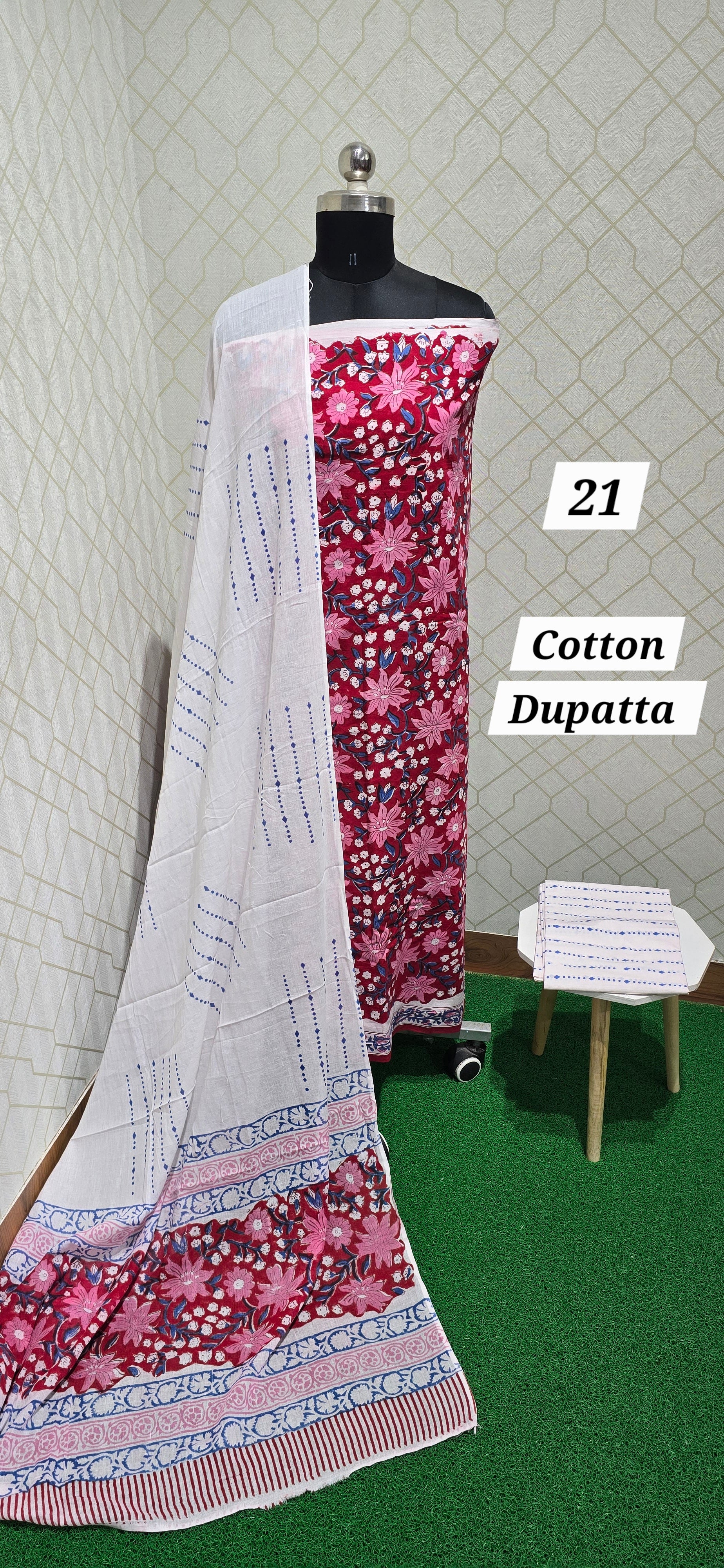 2.5 mtrs Both side block printed premium pure Jaipuri cotton top with neat daman,2.5 mtrs block printed pure jaipuri bottom, block printed pure jaipuri cotton dupatta.