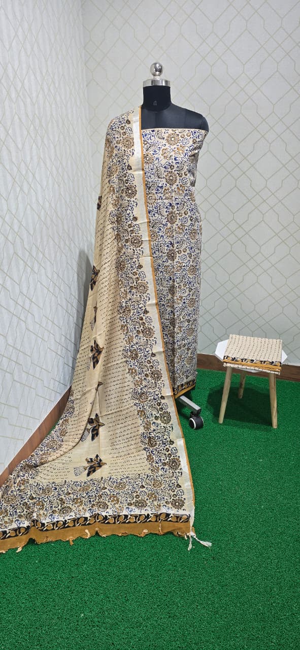2.5 mtrs both side Kantha stitched and block printed premium pure jaipuri cotton top with daman, 2.5 mtrs block printed pure jaipuri cotton bottom (can be stitched as another top too), 2.5 mtrs premium quality block printed linen cotton dupatta with tassels.