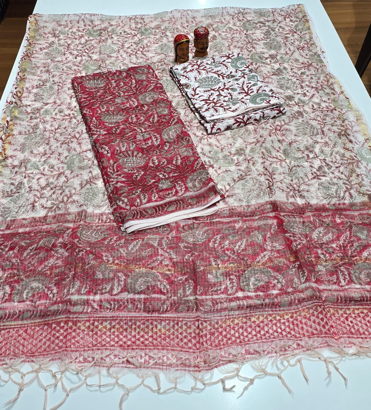 Such a graceful both side irganic vegetable dyed block printed pure kota cotton top with neat daman, printed premium pure cotton bottom, lengthy organic vegetable dyed block printed pure kota cotton dupatta with zari borders and tassels.