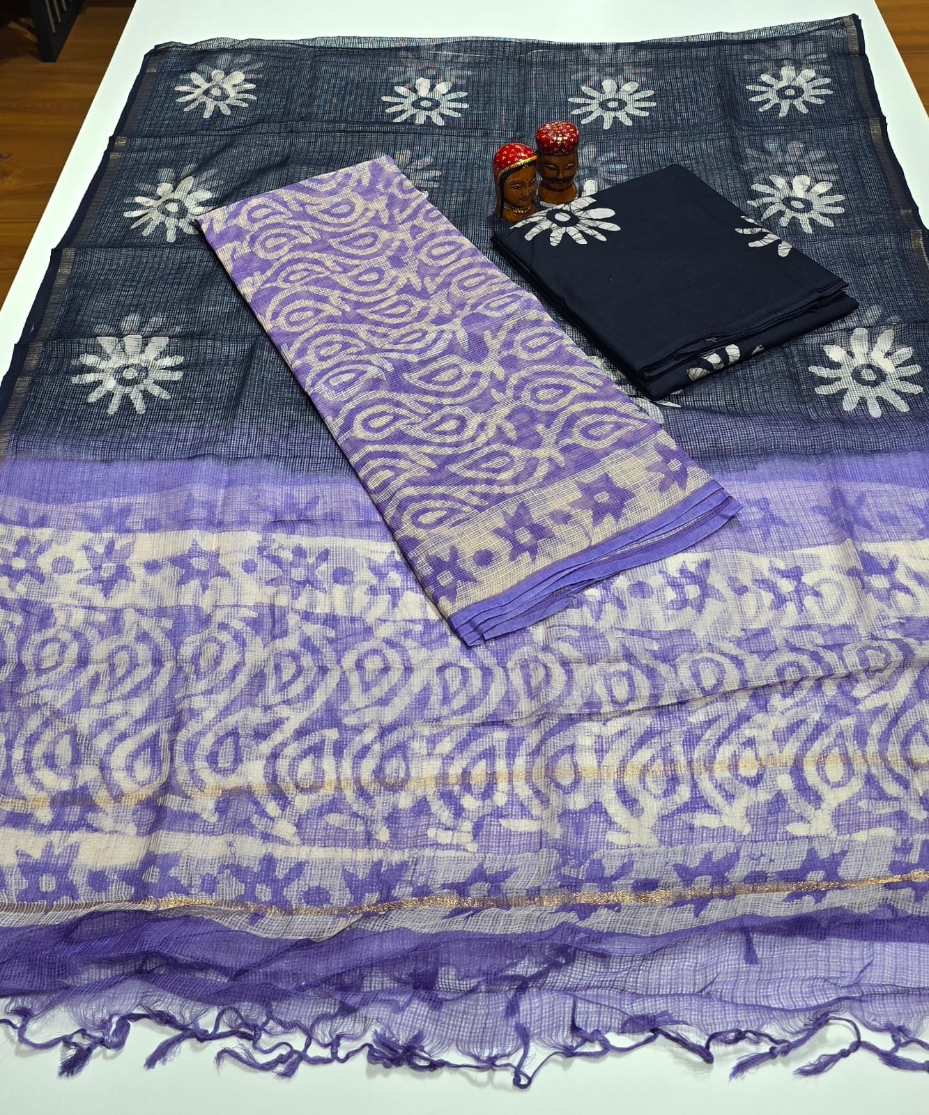 Such a graceful both side irganic vegetable dyed block printed pure kota cotton top with neat daman, printed premium pure cotton bottom, lengthy organic vegetable dyed block printed pure kota cotton dupatta with zari borders and tassels.