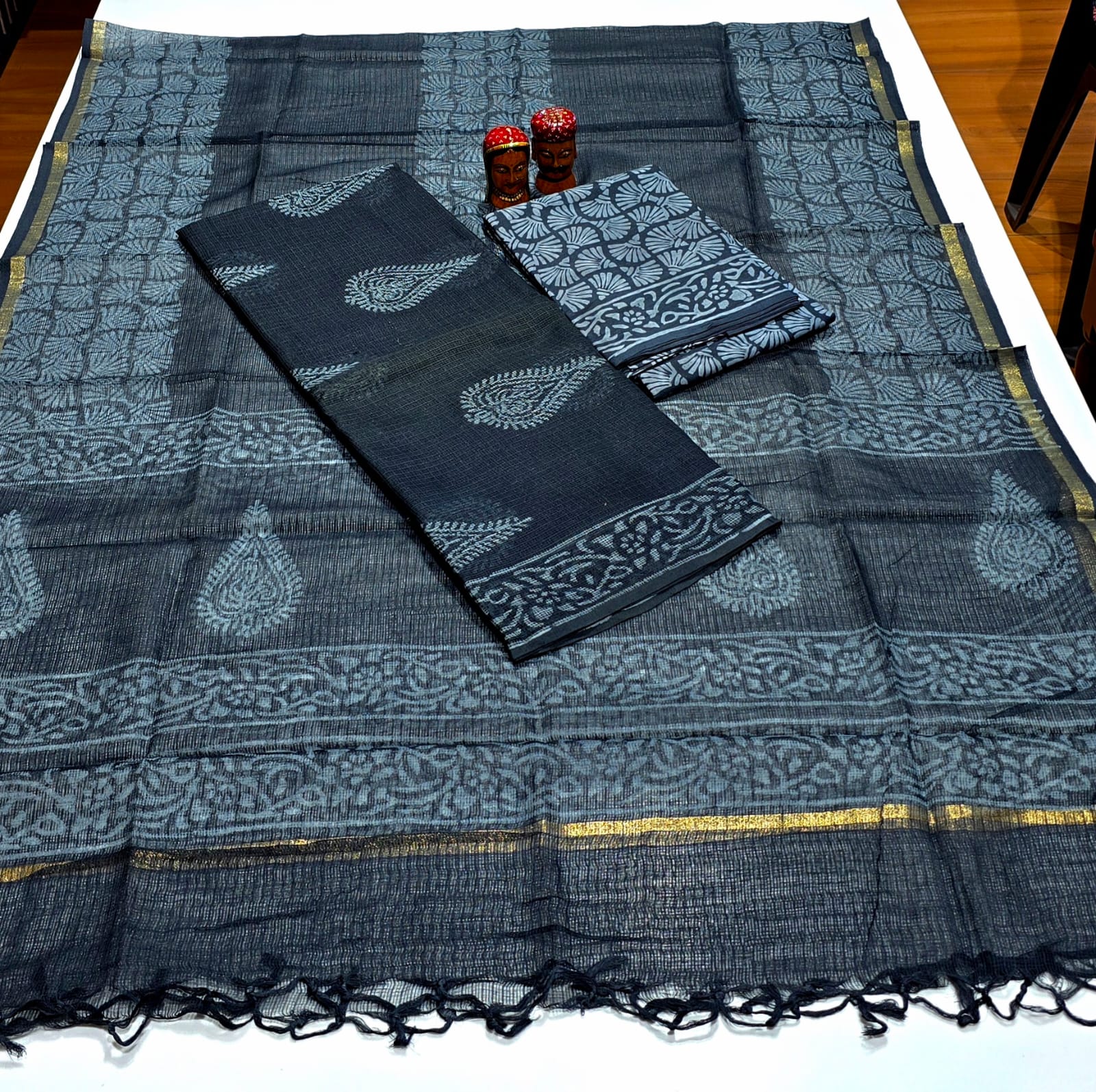 Such a graceful both side irganic vegetable dyed block printed pure kota cotton top with neat daman, printed premium pure cotton bottom, lengthy organic vegetable dyed block printed pure kota cotton dupatta with zari borders and tassels.