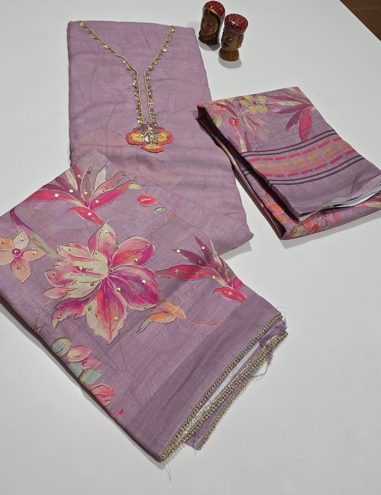 Premium linen cotton top with full neck work,premium santoon cotton bottom, floral printed linen cotton dupatta with gotta work