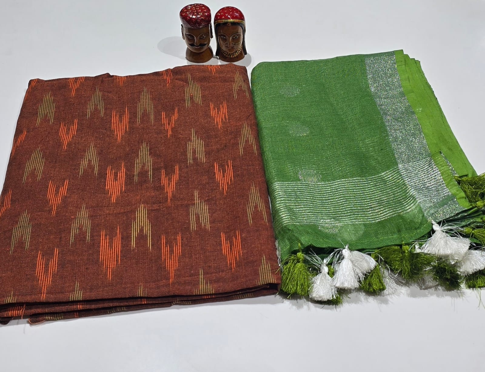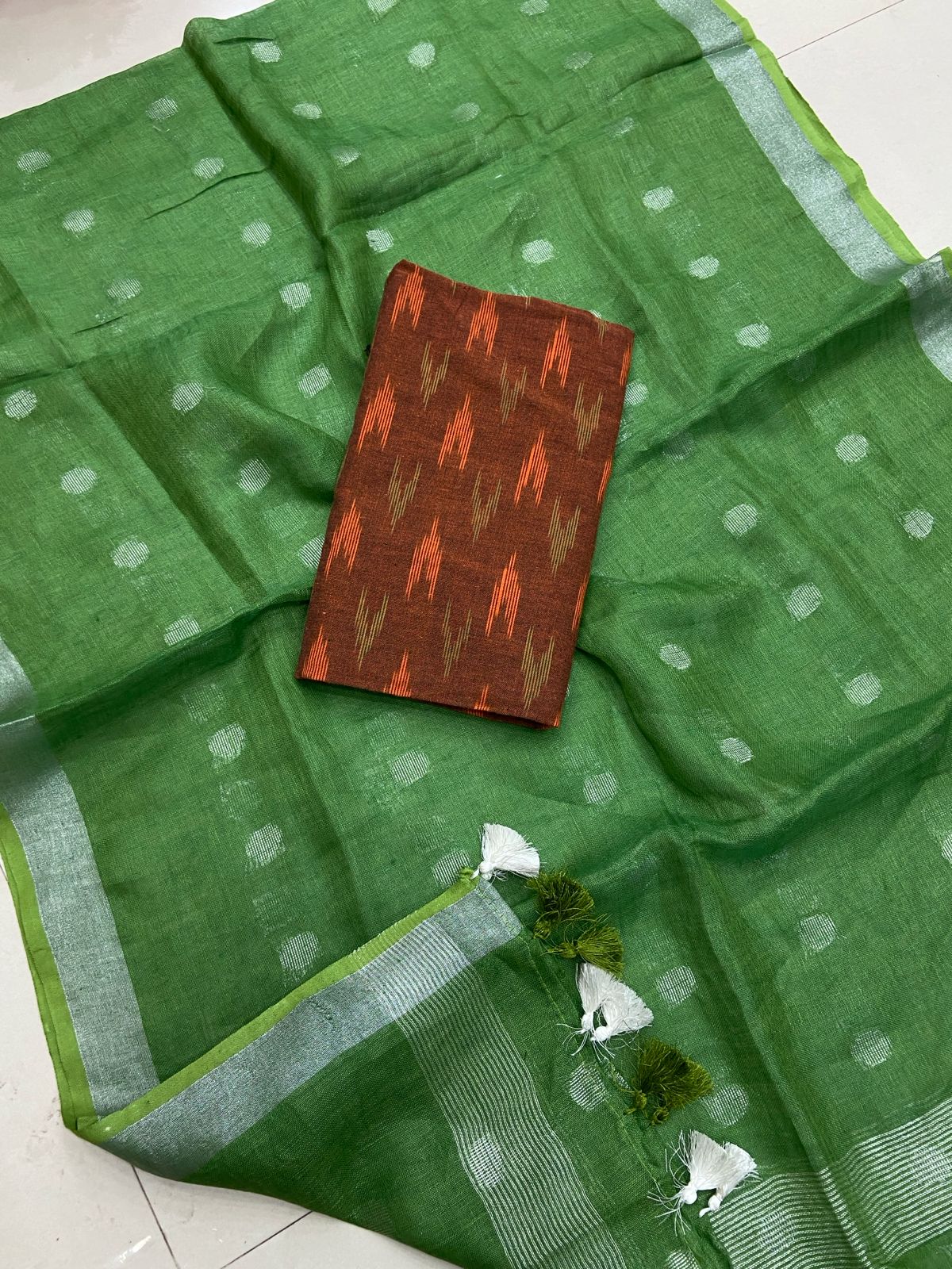 2.5 meters premium quality pure Ikkat cotton top with double side weavings, no bottom, 2.5 meters premium quality pure linen cotton dupatta with silver zari borders and tassels.
