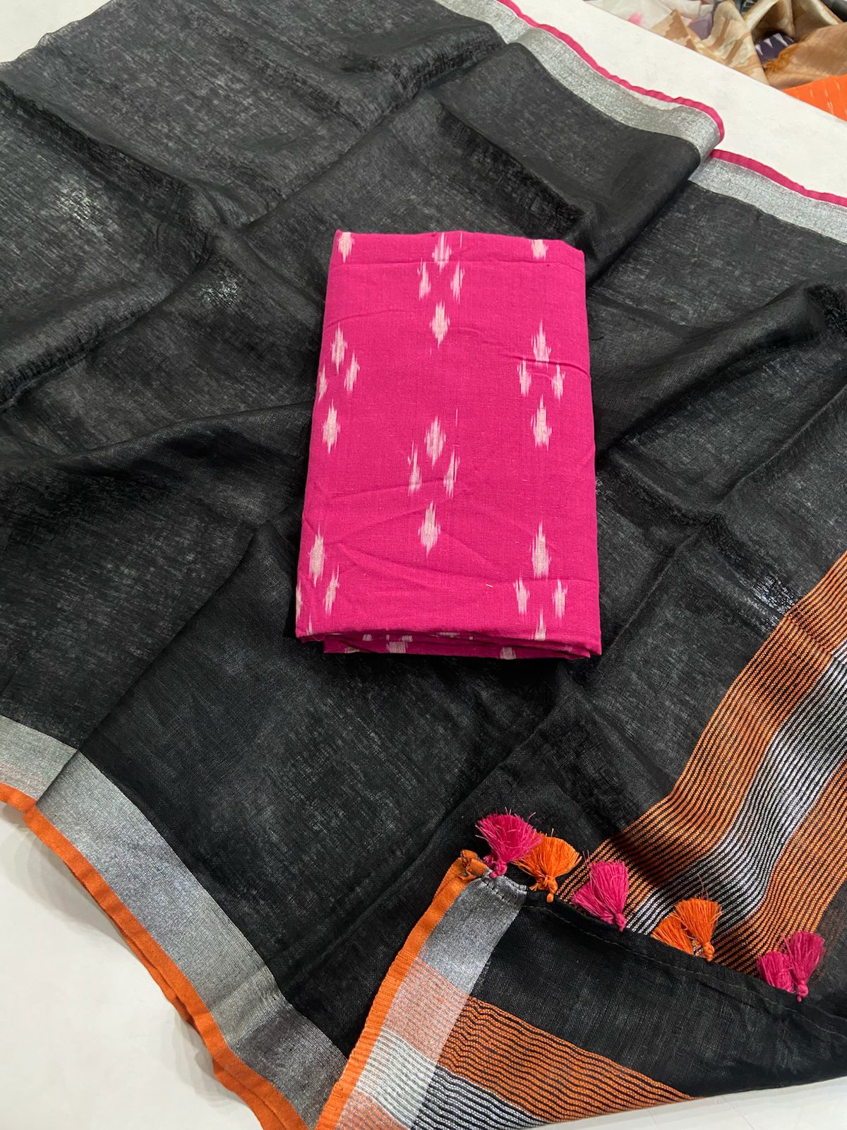 2.5 meters premium quality pure Ikkat cotton top with double side weavings, no bottom, 2.5 meters premium quality pure linen cotton dupatta with silver zari borders and tassels.