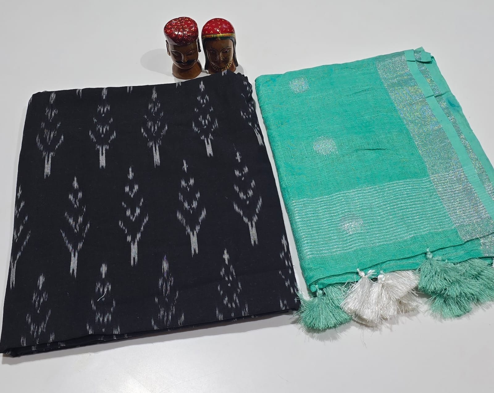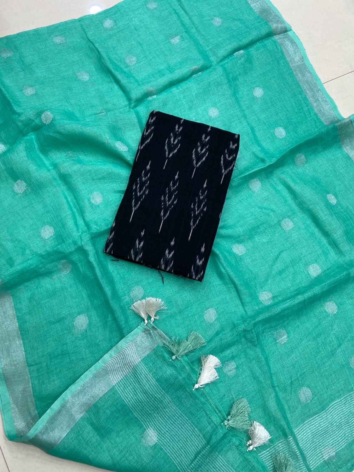 2.5 meters premium quality pure Ikkat cotton top with double side weavings, no bottom, 2.5 meters premium quality pure linen cotton dupatta with silver zari borders and tassels.