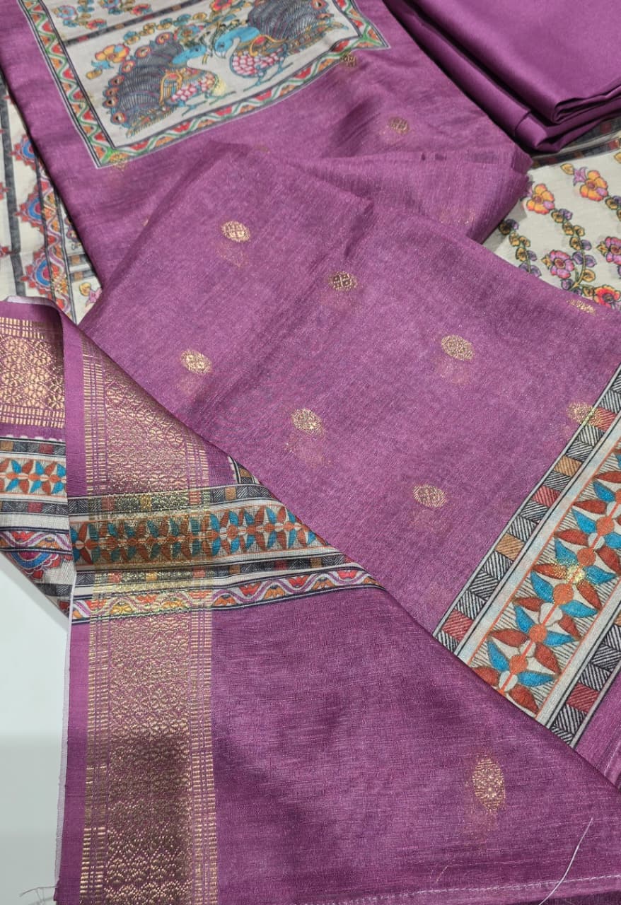 Excellent quality both side zari butta weaved rich looking silk top with a beautiful peacock neck pattern, premium santoon bottom, digital printed and zari weaved silk dupatta.