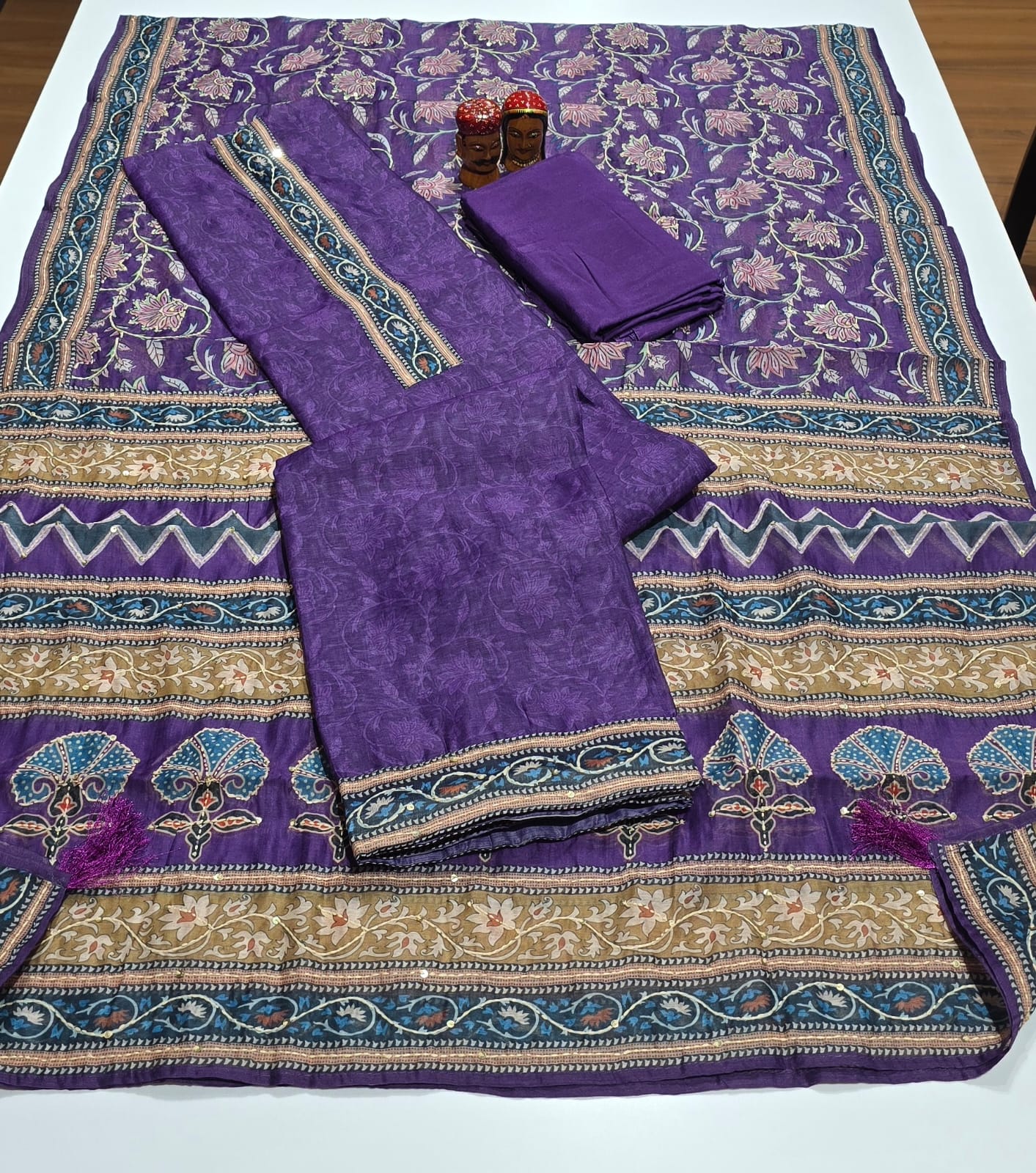 Both side digital printed excellent quality pure silk cotton top with a grand neck pattern done with sequence work and kantha stitch, and same for daman, premium satoon bottom, printed premium rich looking silk cotton dupatta with heavy hand weavings and tassels.