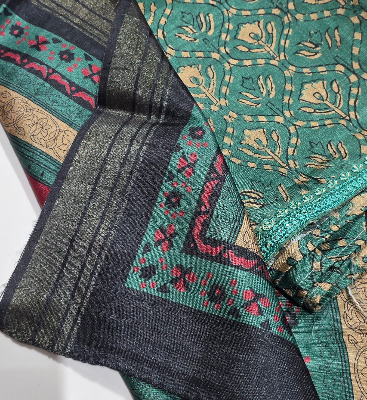 Excellent quality both side digital printed geecha weaved tussar silk top with neck work, neat daman, cotton bottom, geecha weaved semi tussar silk dupatta with zari borders.