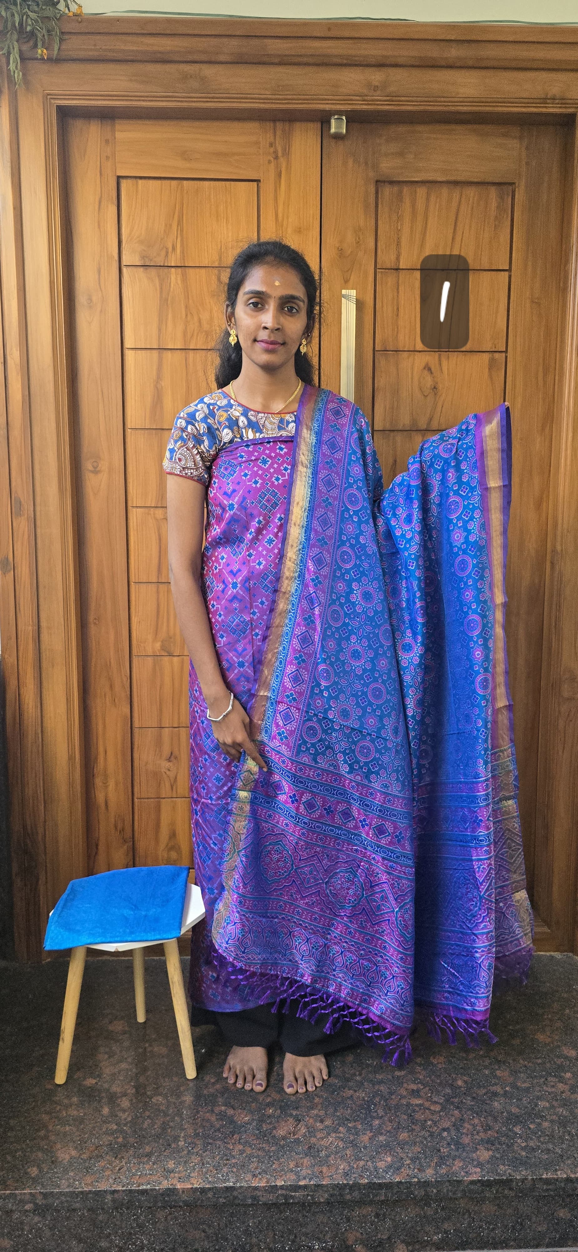 Both side printed patola silk top, patola printed bottom, patola printed 2.5 mtrs lengthy silk dupatta with borders and tassels.