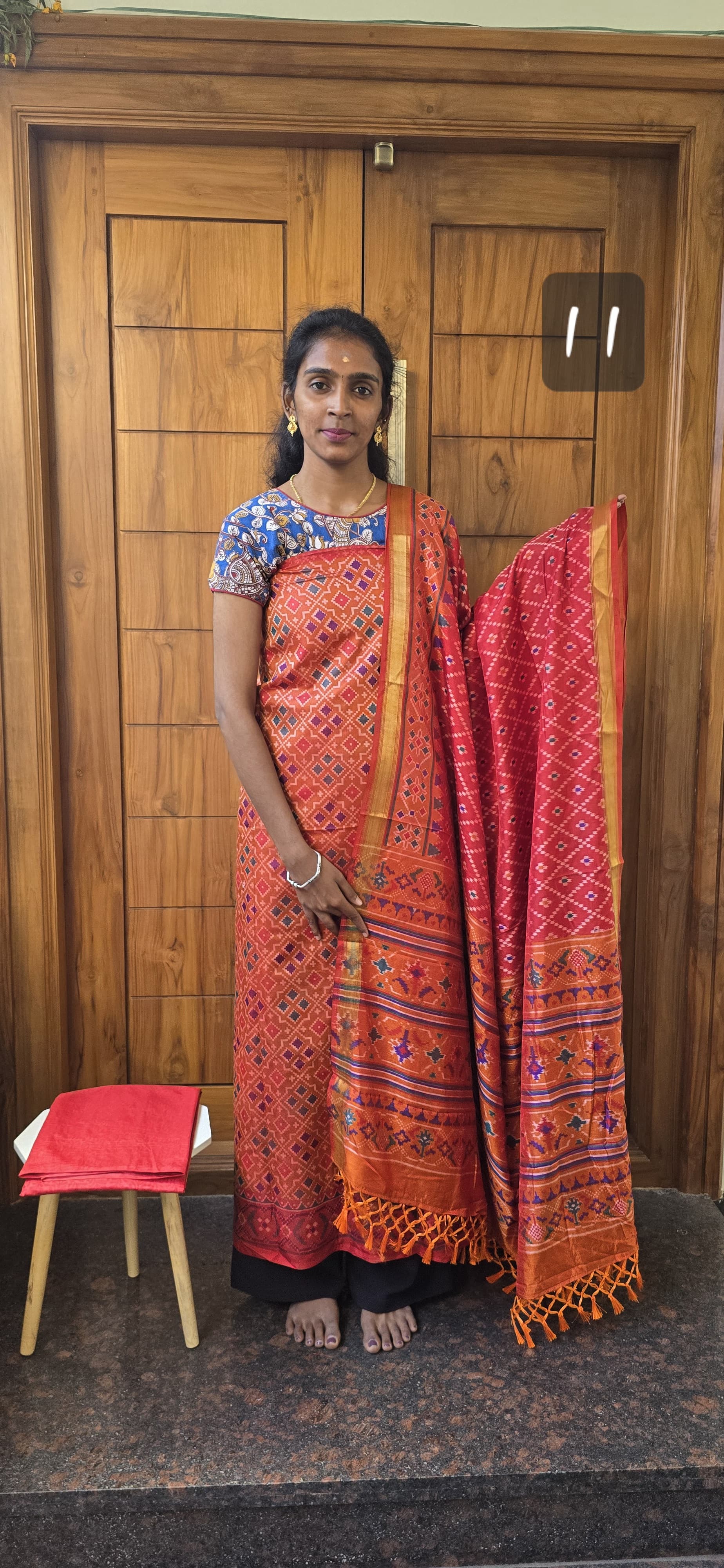 Both side printed patola silk top, patola printed bottom, patola printed 2.5 mtrs lengthy silk dupatta with borders and tassels.