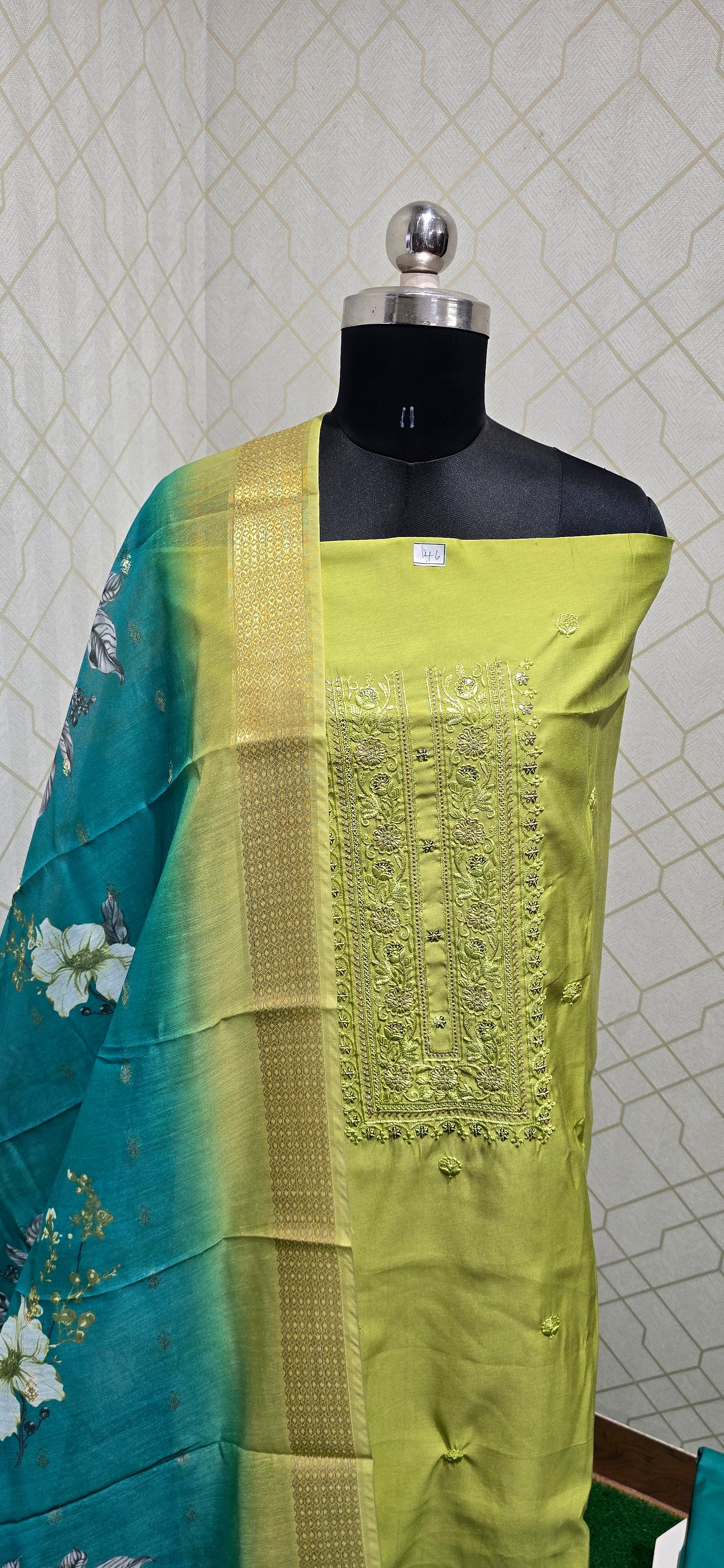 Fine quality both soft silk top with embroided and sequence worked neck pattern, all over embroidery and sequence work, cotton bottom, very elegant floral printed and zari weaved organza dupatta with very elegant zari borders.