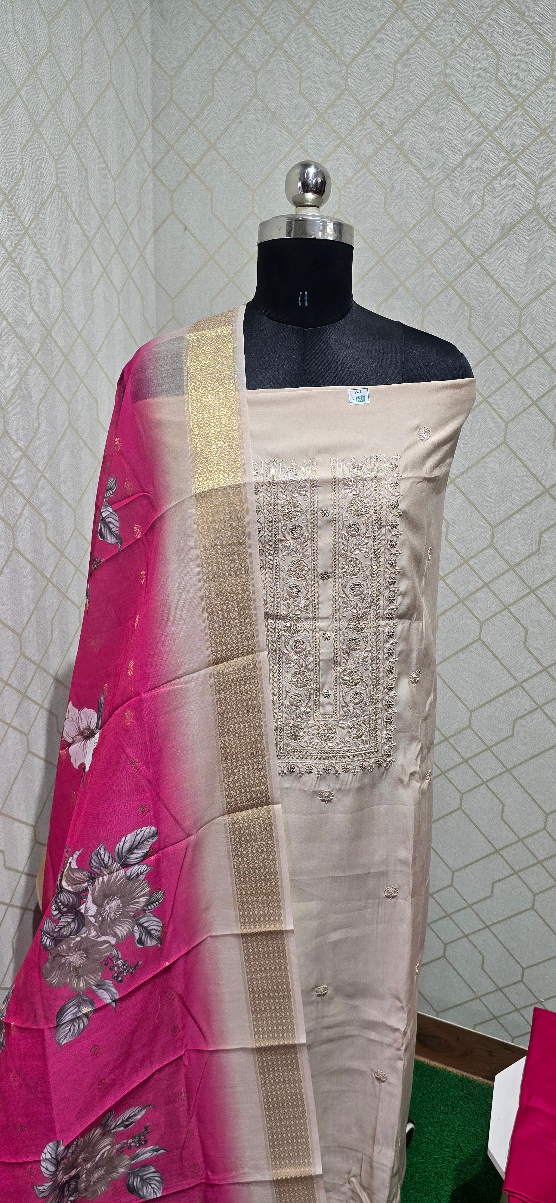 Fine quality both soft silk top with embroided and sequence worked neck pattern, all over embroidery and sequence work, cotton bottom, very elegant floral printed and zari weaved organza dupatta with very elegant zari borders.
