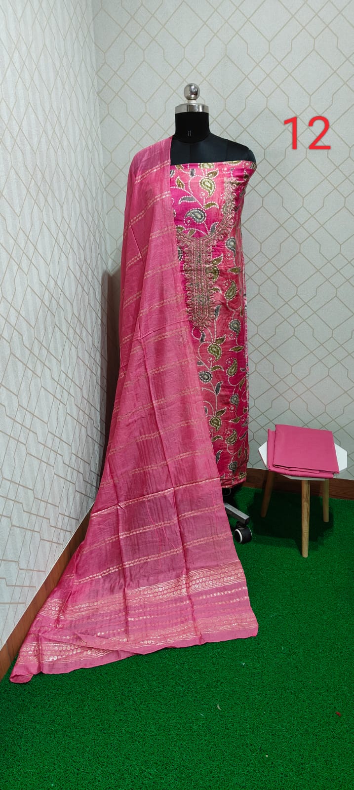 Both side digital printed excellent semi modal silk top with grand neck work, cotton bottom, sequence worked and zari weaved soft silk dupatta...