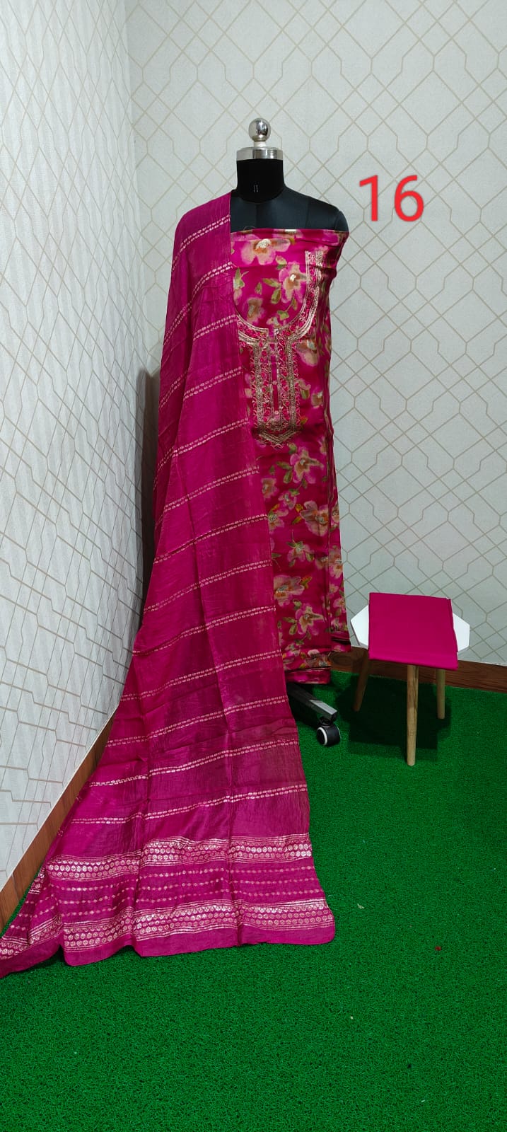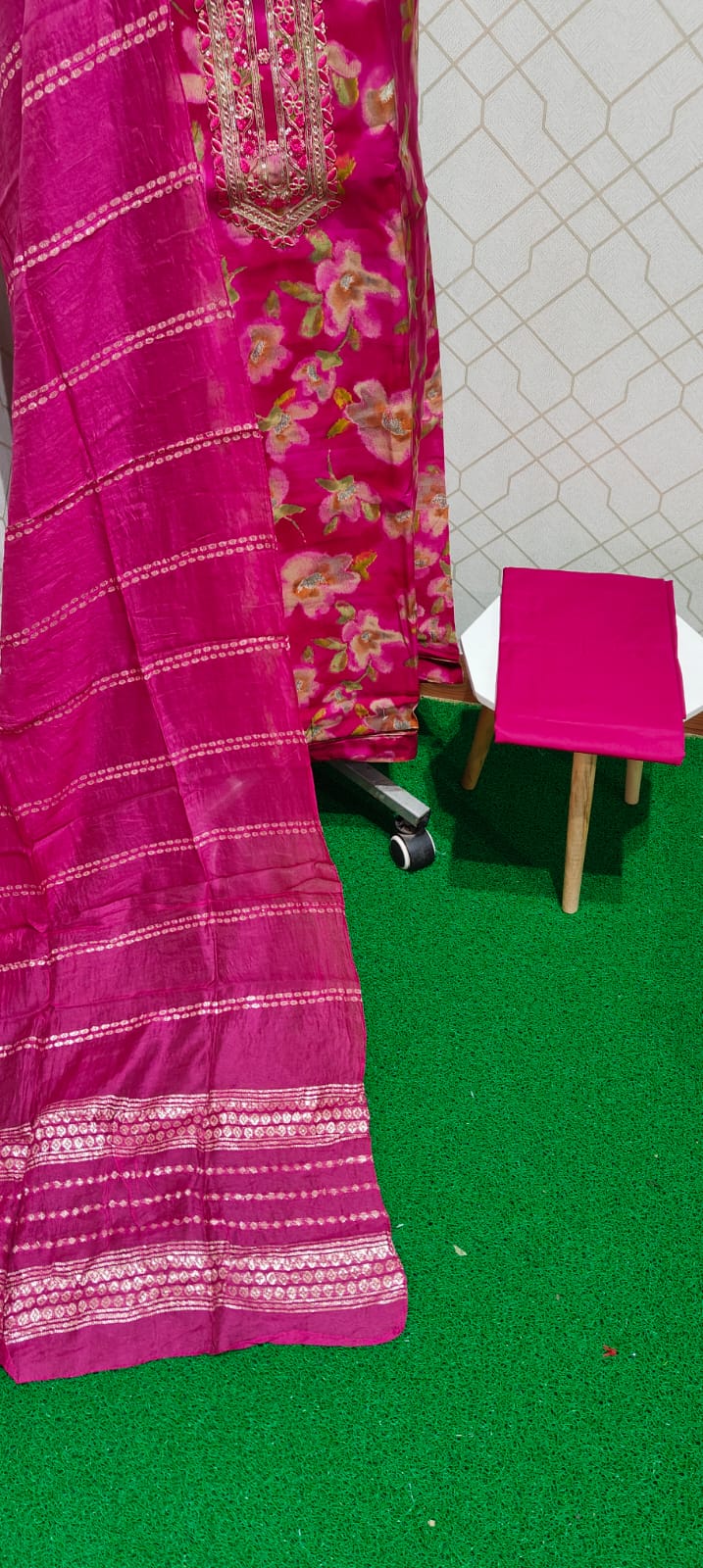 Both side floral printed excellent semi modal silk top with grand neck grand neck work, cotton bottom, fully sequence worked and jaccard weaved soft silk dupatta...