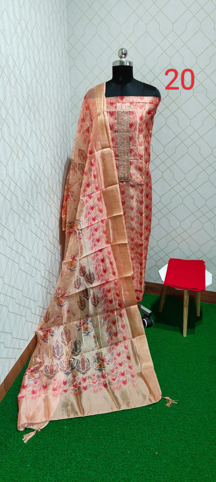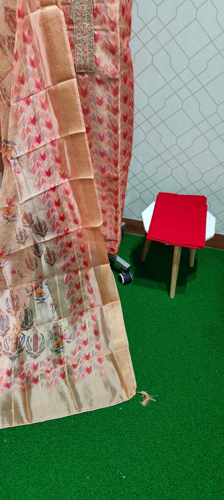 Both side digital printed excellent tissue silk top with grand neck work, cotton bottom, digital printed silk dupatta with zari borders and tassels.