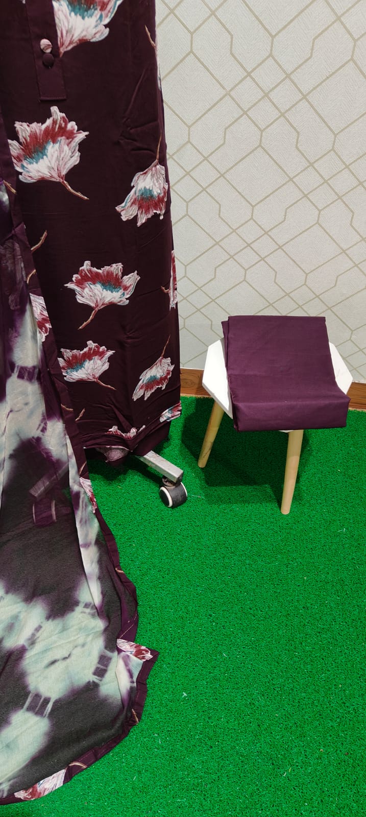 Both side floral printed excellent soft reyon cotton top with neck patch, cotton bottom, pure chiffon dupatta with tapings..