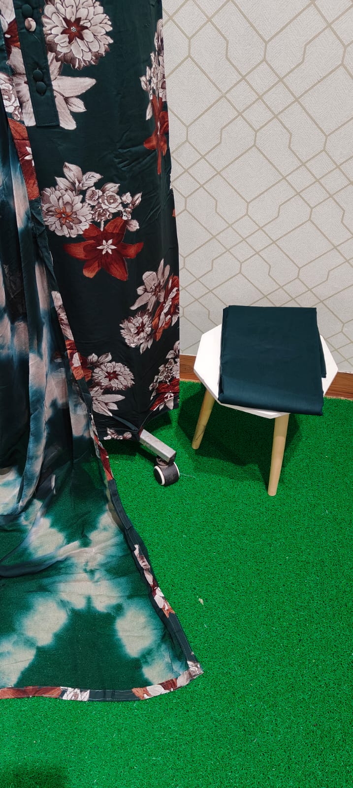 Both side floral printed excellent soft reyon cotton top with neck patch, cotton bottom, pure chiffon dupatta with tapings..