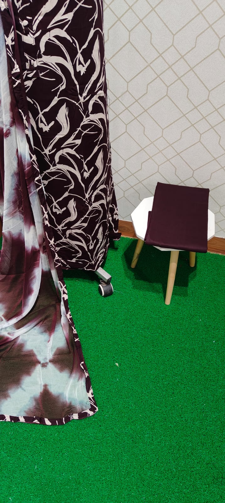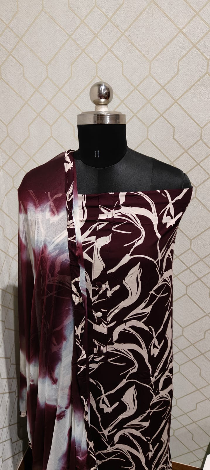 Both side floral printed excellent soft reyon cotton top with neck patch, cotton bottom, pure chiffon dupatta with tapings..