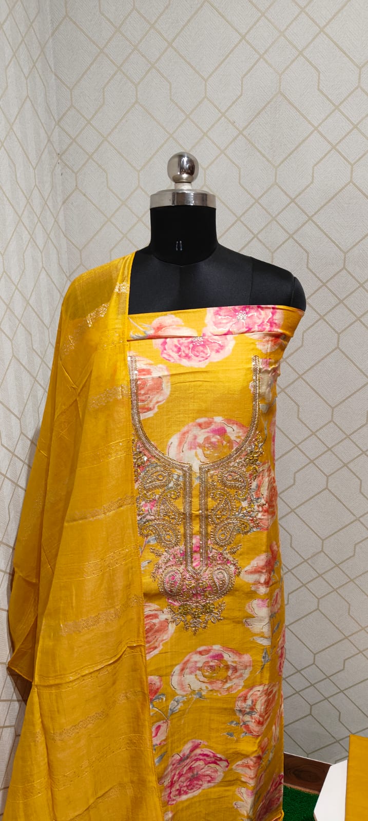Both side digital printed excellent semi modal silk top with grand neck work, cotton bottom, sequence worked and zari weaved soft silk dupatta...