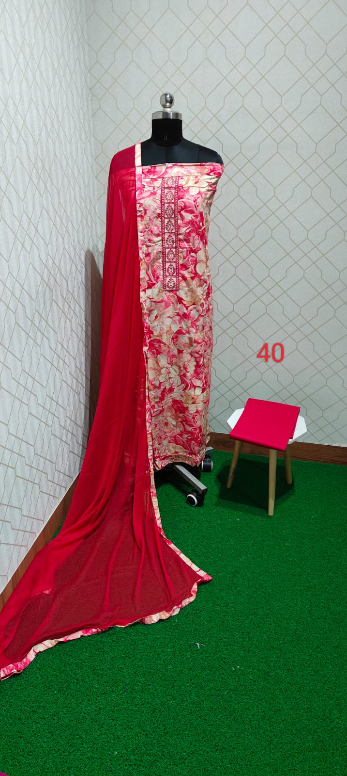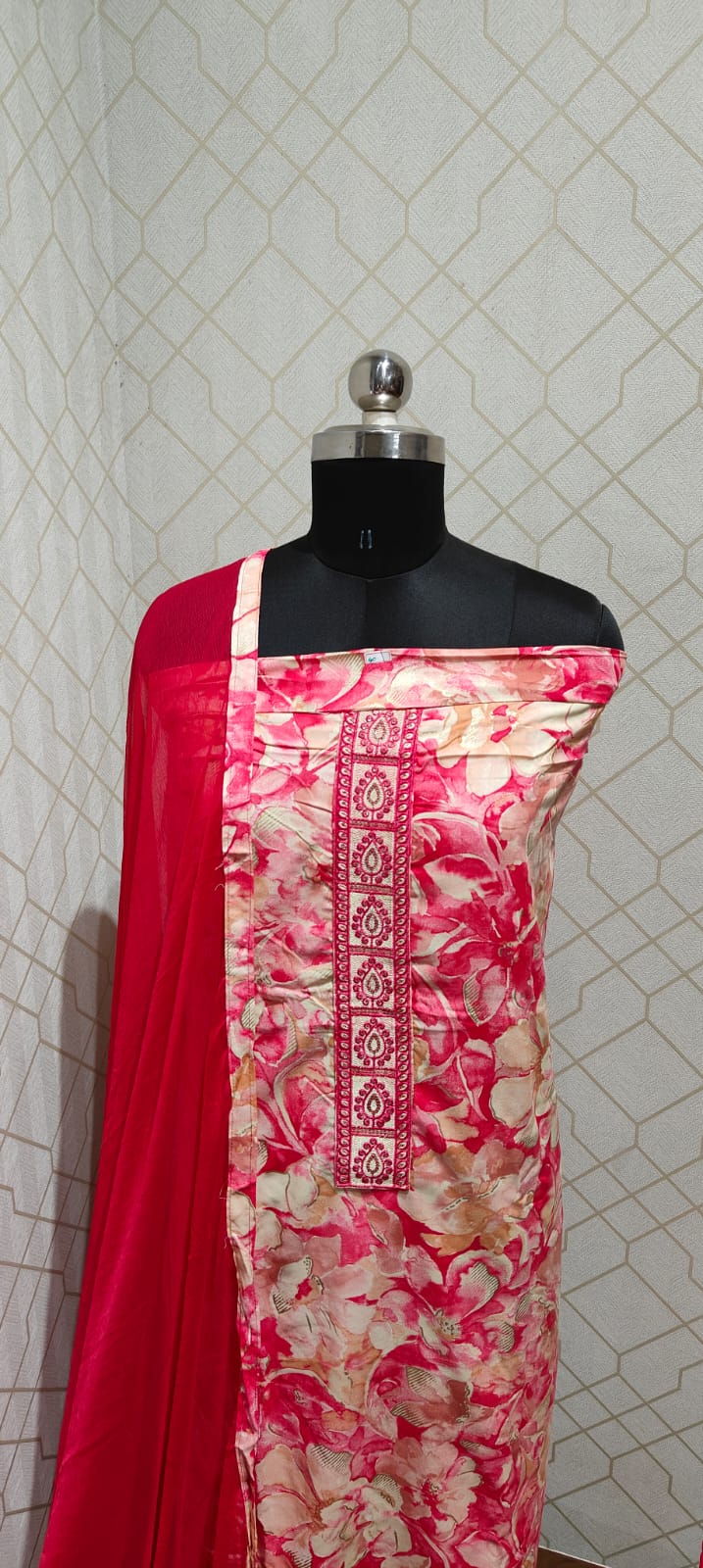 Both side digital printed excellent soft silk top with neck work, cotton bottom, pure chiffon dupatta with tapings...