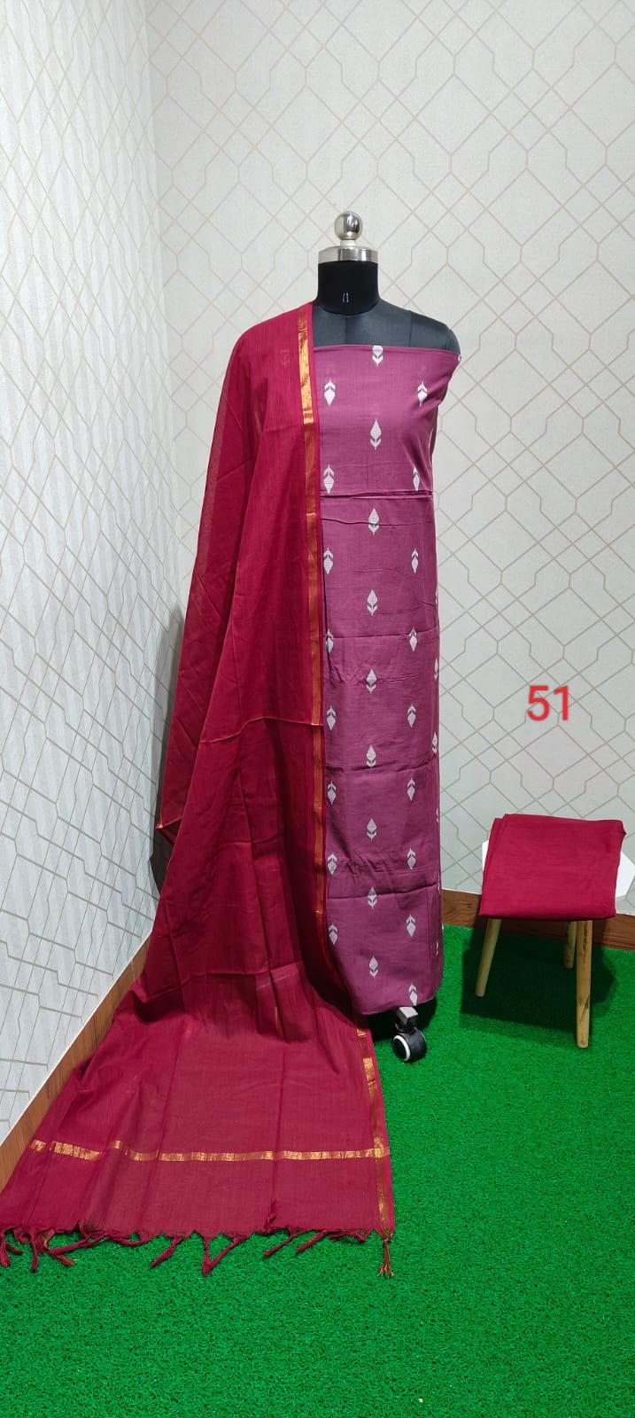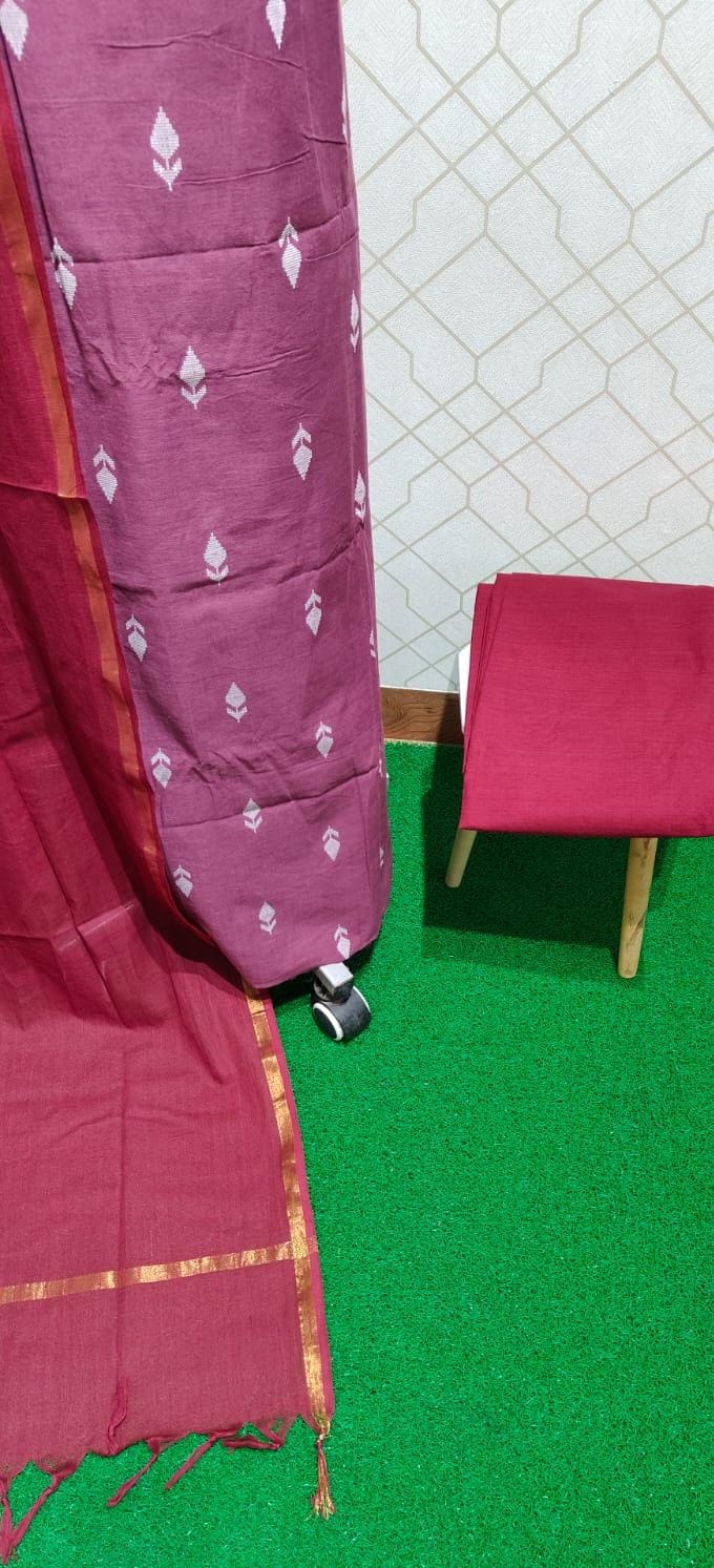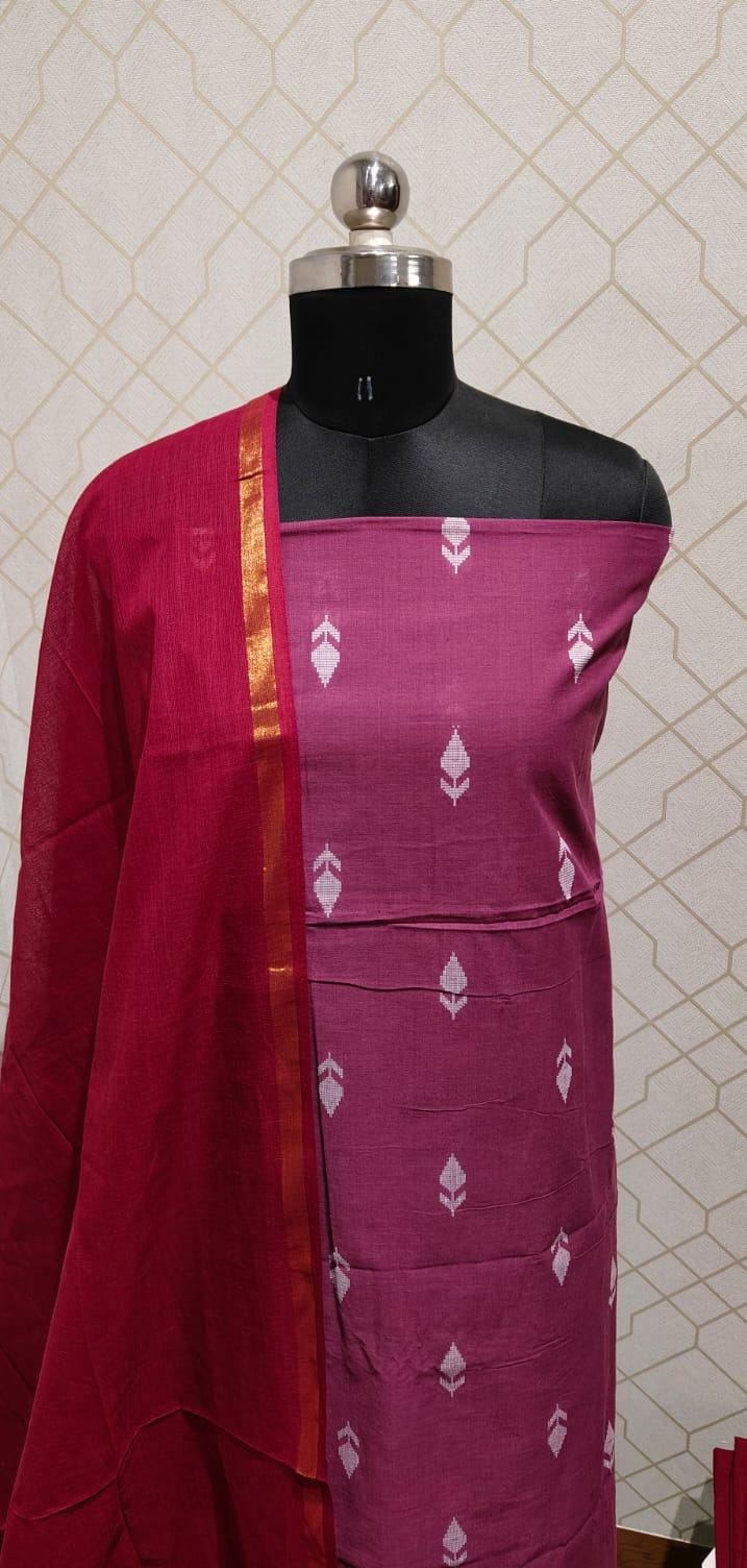 Much rich quality best selling 2.5 meters pure cotton top with both side weaving, pure cotton bottom, pure cotton dupatta with zari borders and tassels.