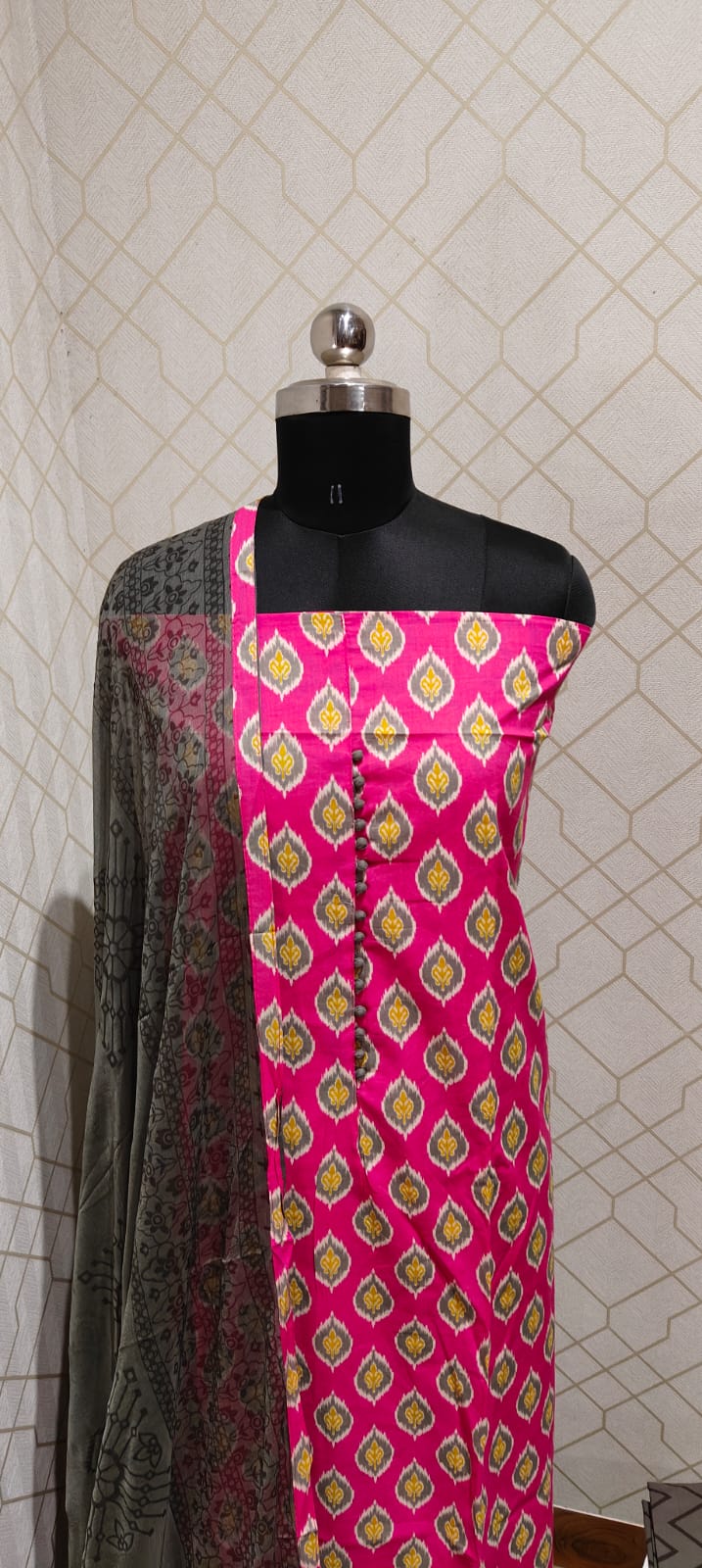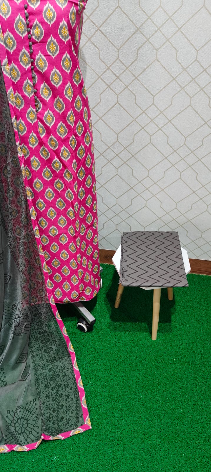 Both side printed pure jaipur cotton top with potli buttons,printed pure cotton bottom, pure chiffon dupatta with tapings..