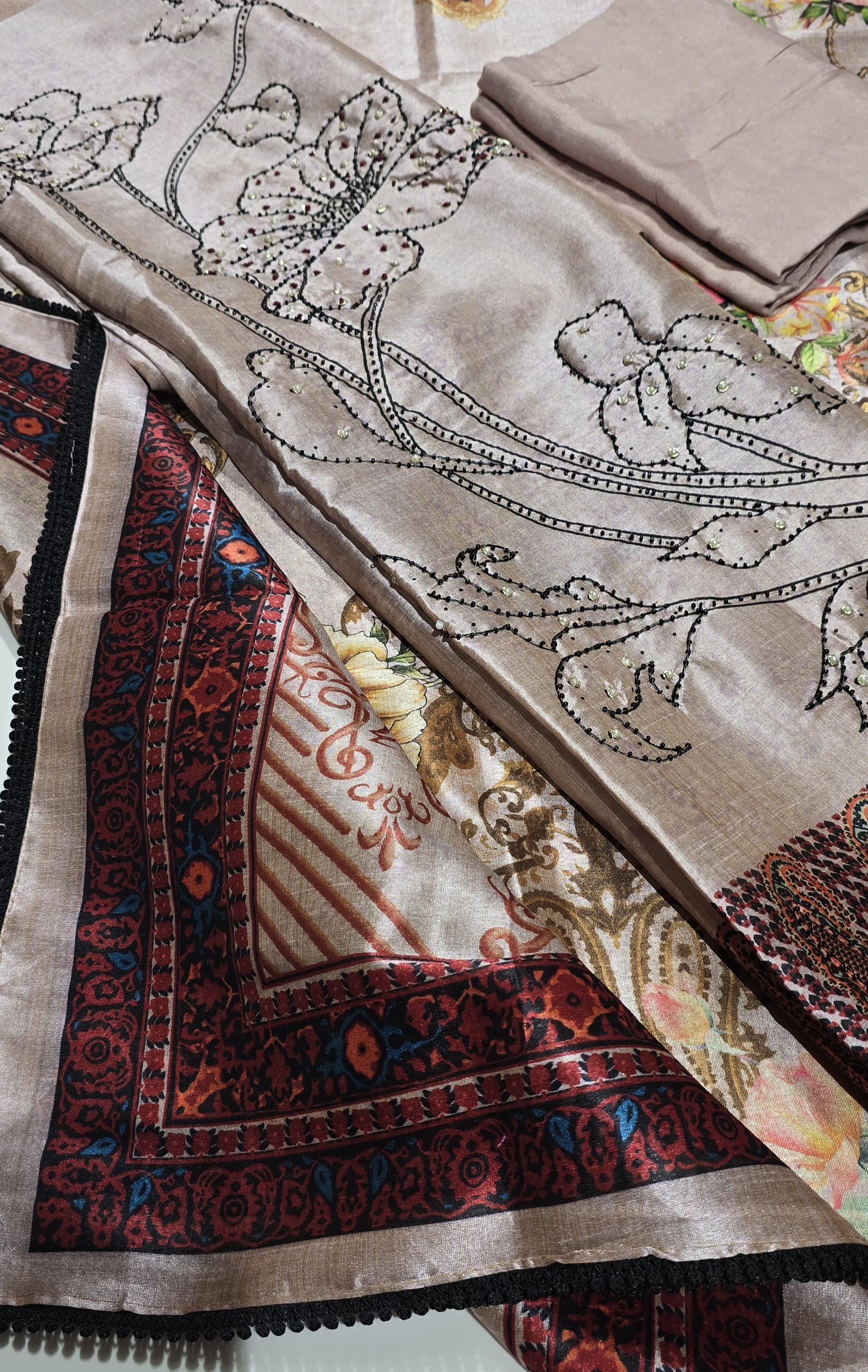 Very rich looking tussar silk top with grand looking daman with hand work, premium santoon bottom, digital printed tussar silk dupatta with crochet borders.
