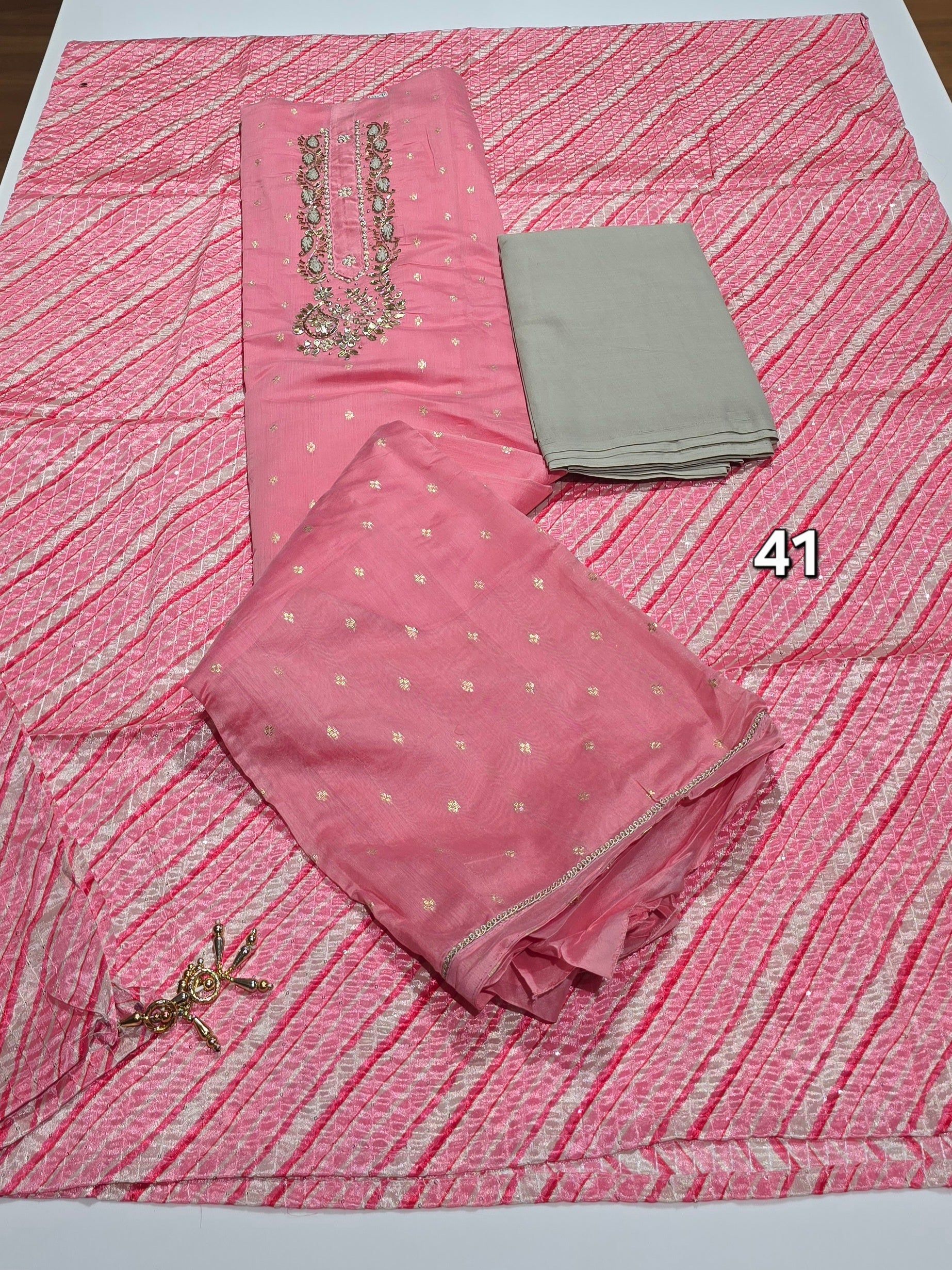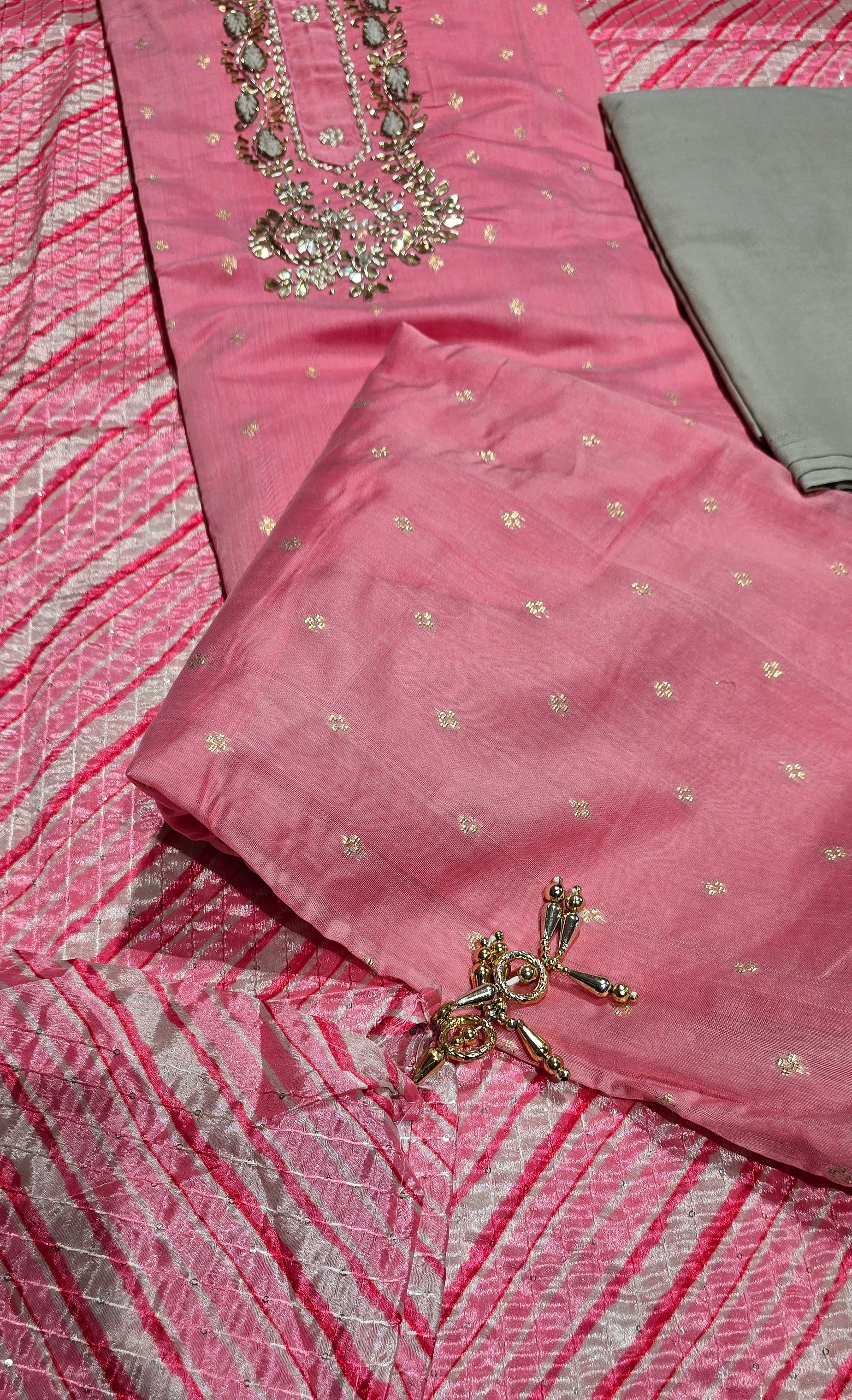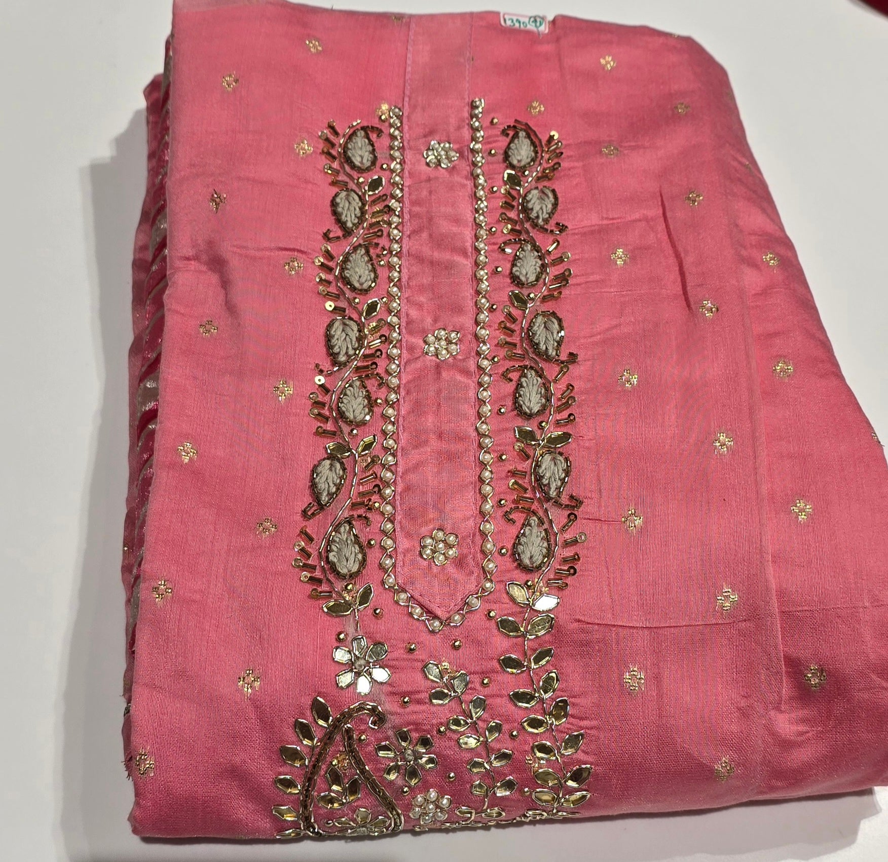 Very grand looking premium silk top with all hand work for neck and daman, all over butta weavings, cotton bottom, excellent quality digital printed crushed silk dupatta with tassels.