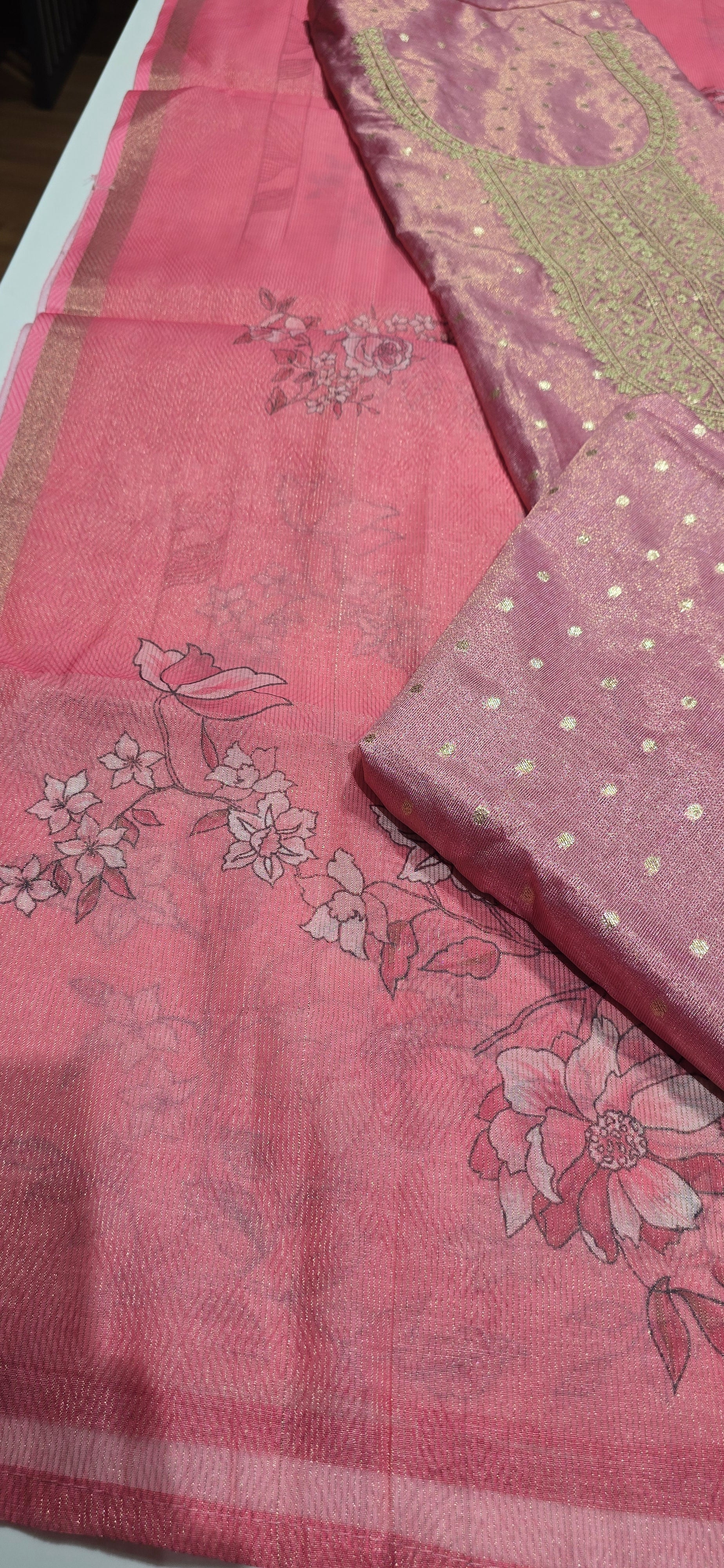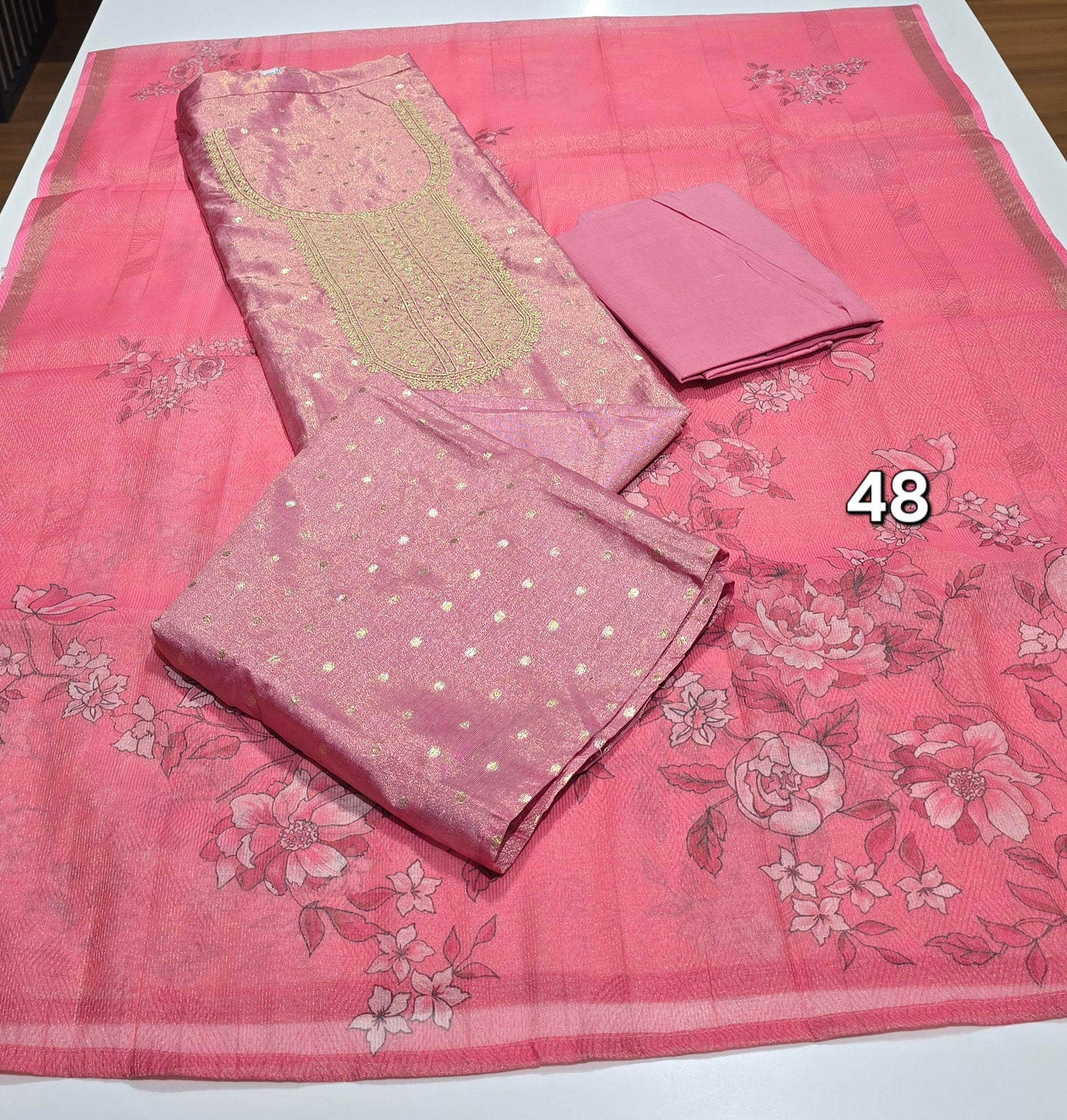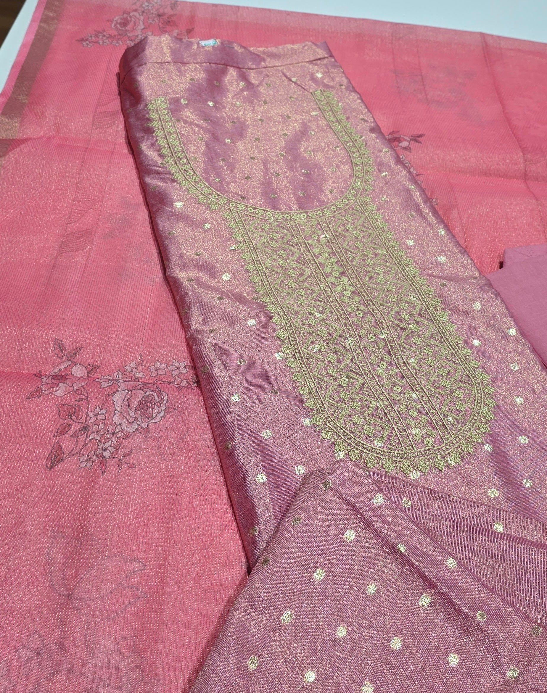 Very grand looking premium pure tissue silk top with neck work, all over zari weavings, premium santoon bottom, minute zari weaved digital printed pure tissue silk dupatta with zari borders.