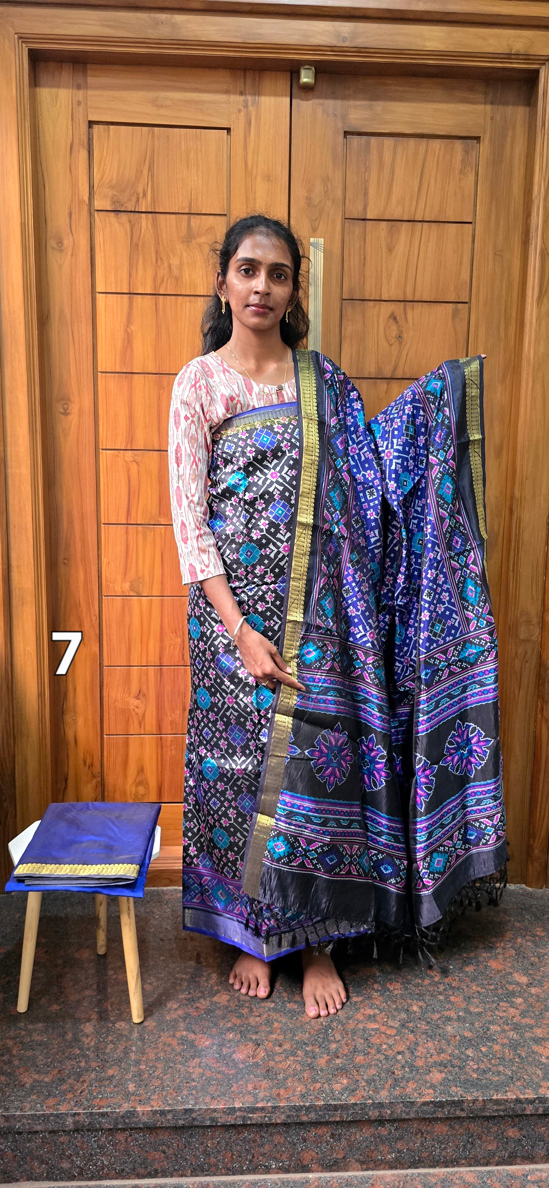 Both side printed patola silk top with small kanchi borders, patola printed bottom with kanchi borders, patola printed 2.5 mtrs lengthy silk dupatta with borders and tassels.