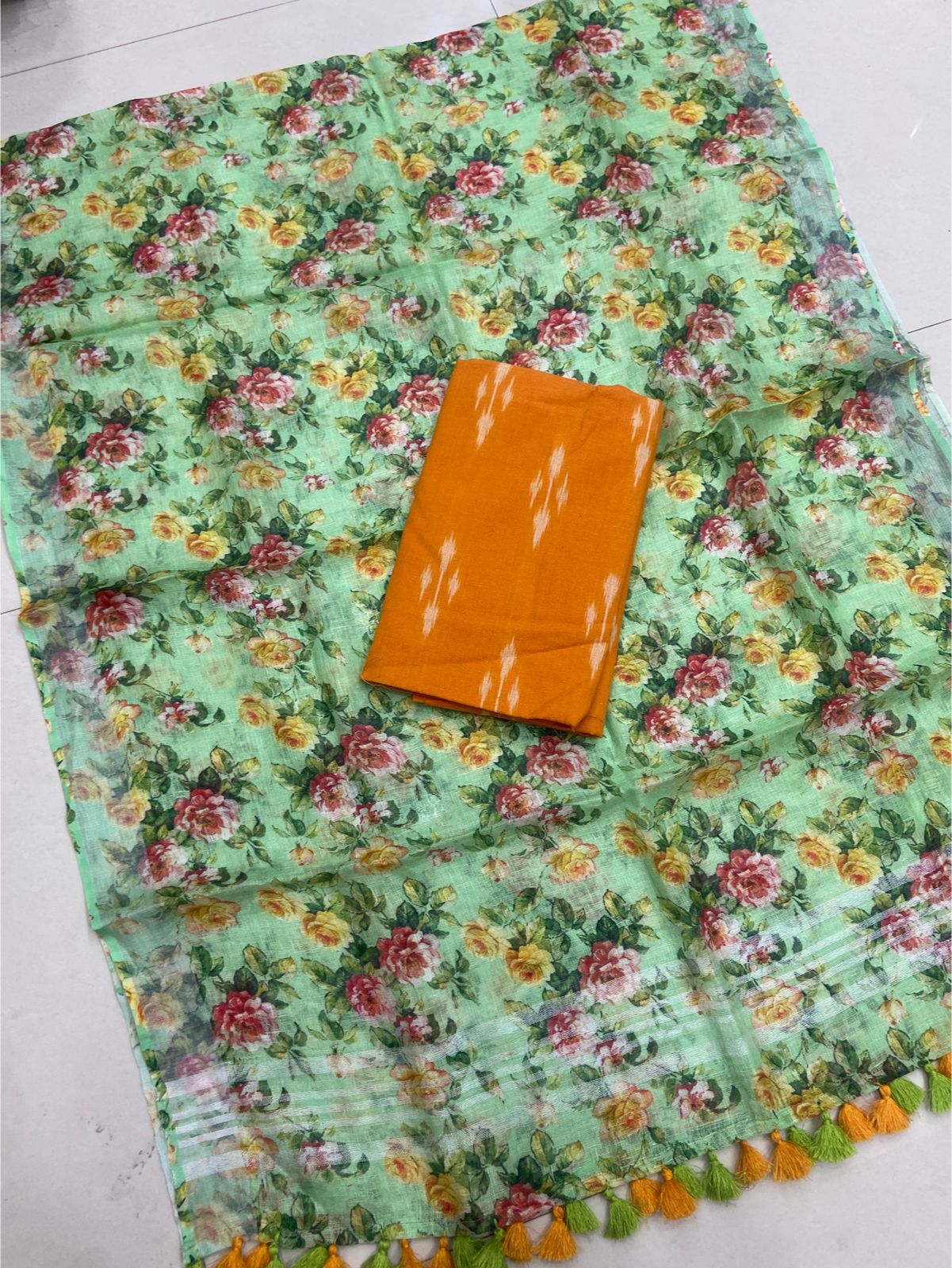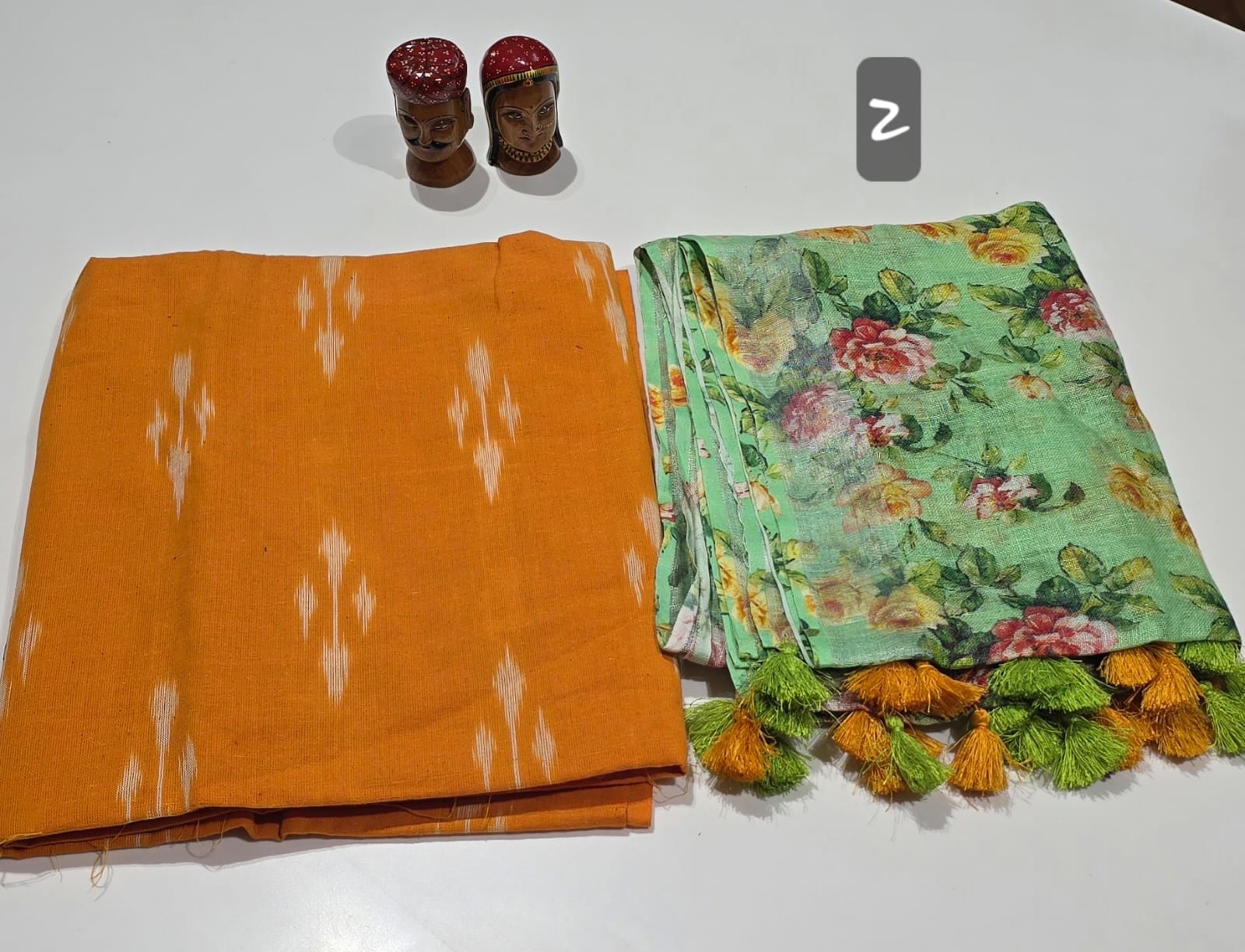 2.5 meters premium quality pure Ikkat cotton top with double side weavings, no bottom, 2.5 meters premium quality pure linen cotton dupatta with silver zari borders and tassels.