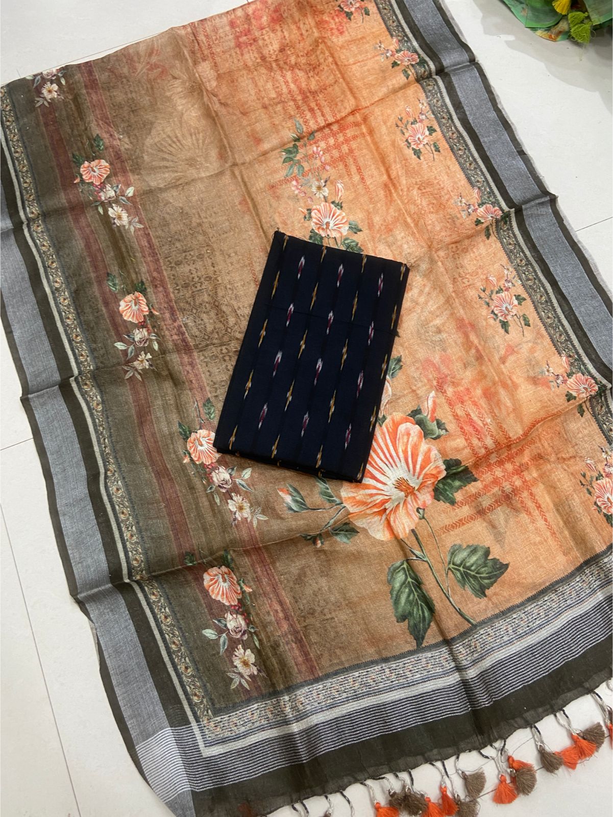 2.5 meters premium quality pure Ikkat cotton top with double side weavings, no bottom, 2.5 meters premium quality pure linen cotton dupatta with silver zari borders and tassels.