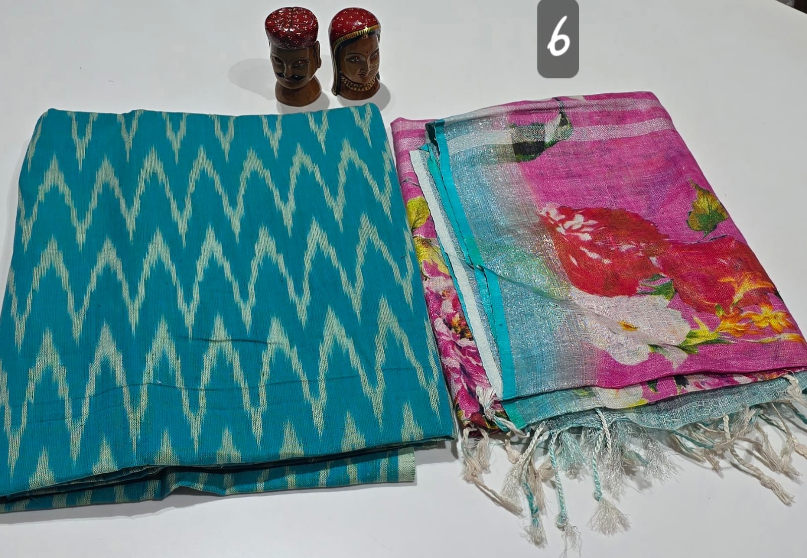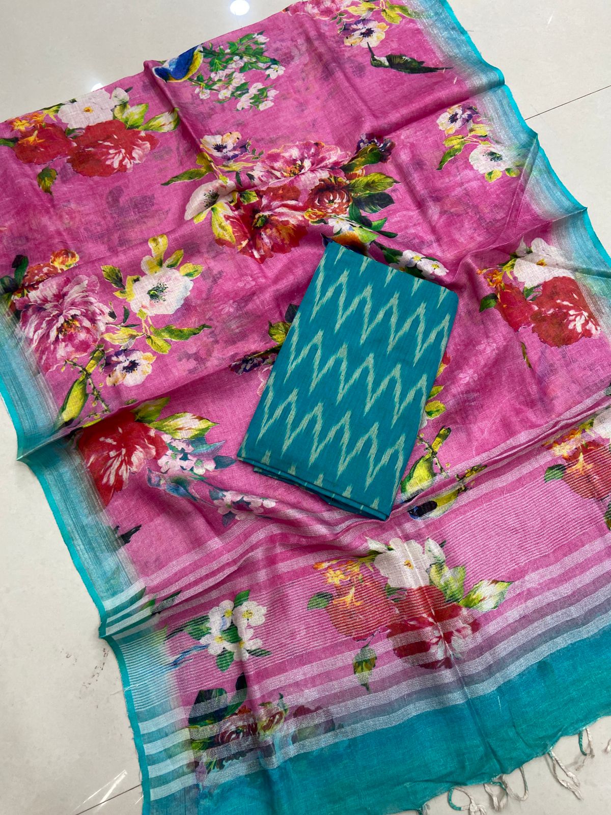 2.5 meters premium quality pure Ikkat cotton top with double side weavings, no bottom, 2.5 meters premium quality pure linen cotton dupatta with silver zari borders and tassels.