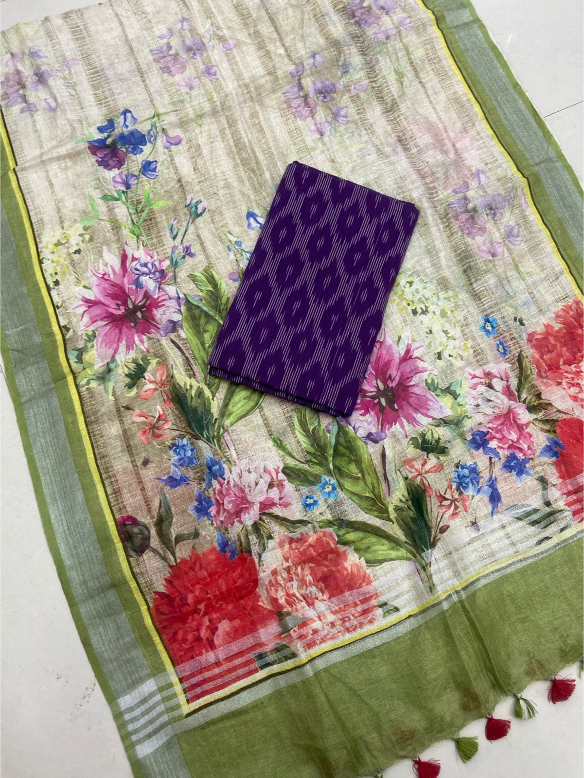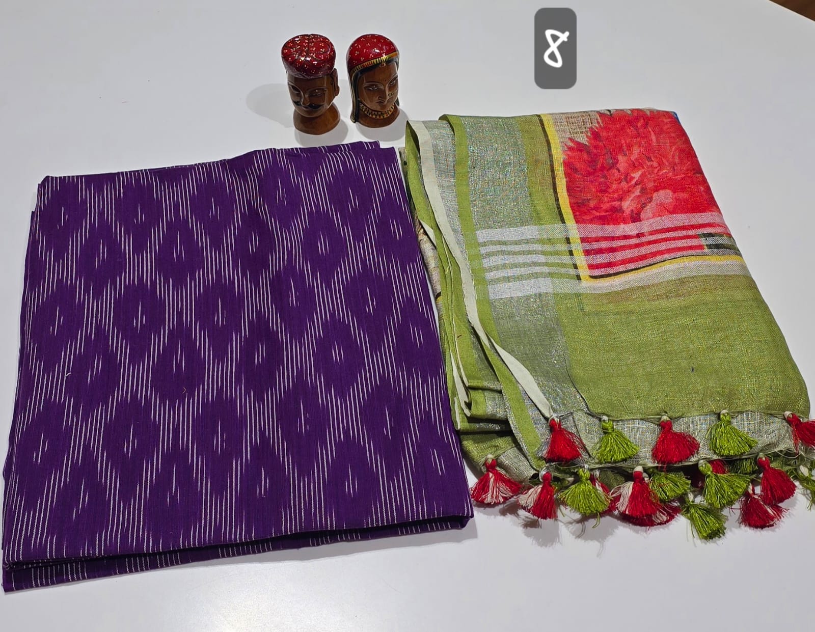 2.5 meters premium quality pure Ikkat cotton top with double side weavings, no bottom, 2.5 meters premium quality pure linen cotton dupatta with silver zari borders and tassels.