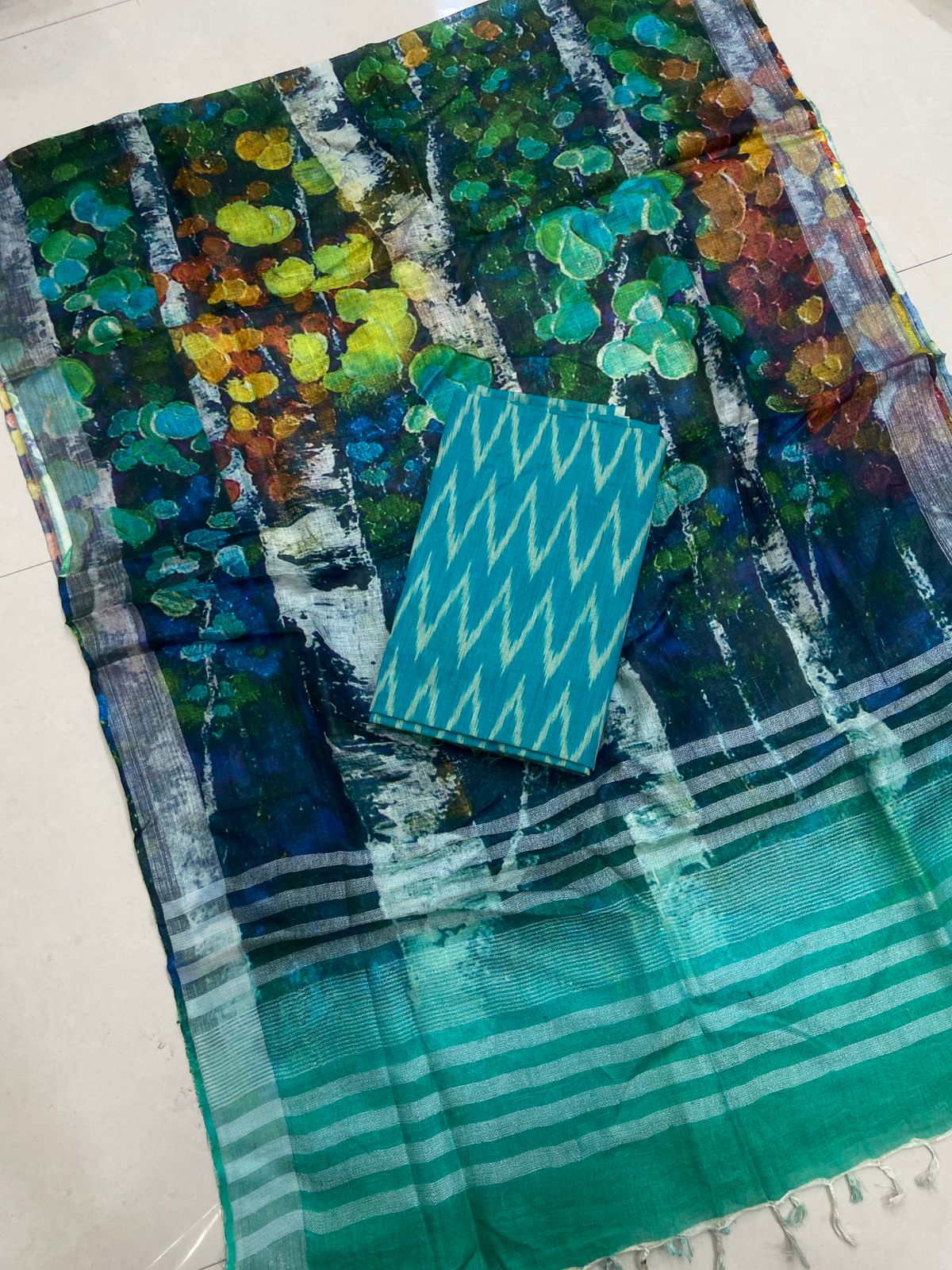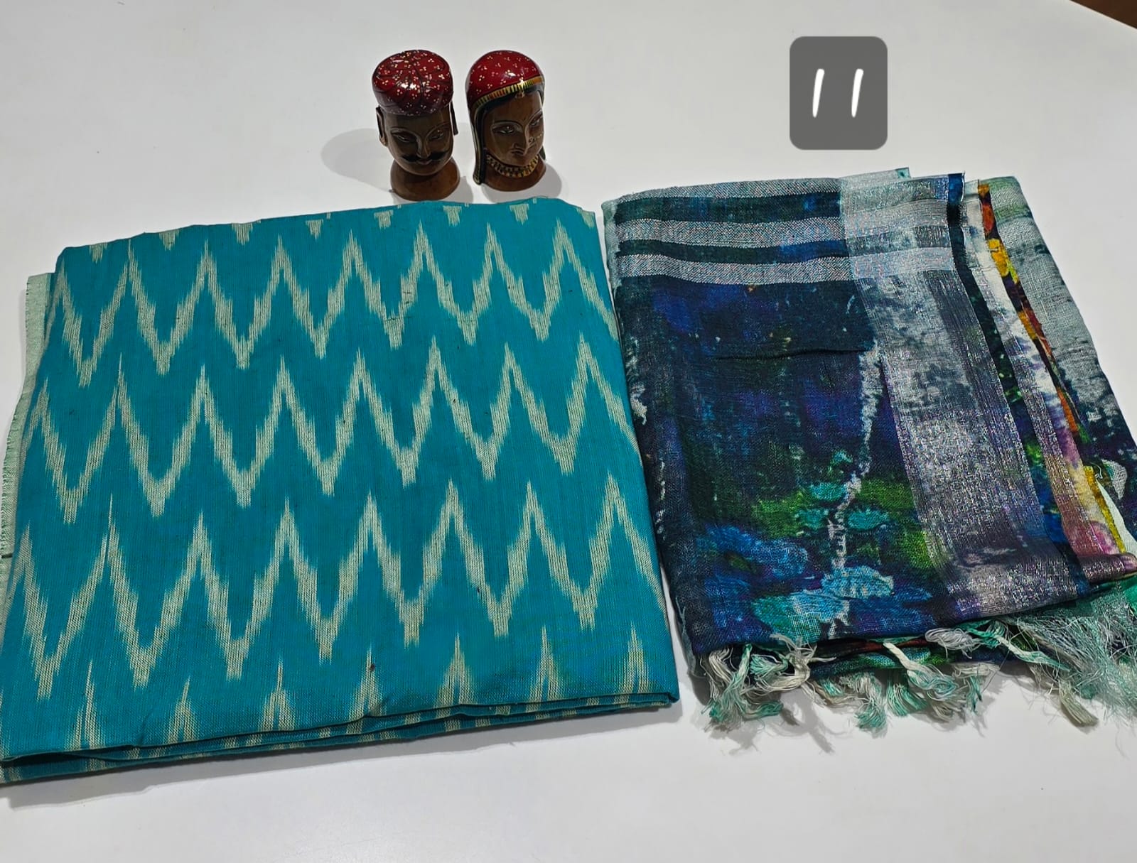 2.5 meters premium quality pure Ikkat cotton top with double side weavings, no bottom, 2.5 meters premium quality pure linen cotton dupatta with silver zari borders and tassels.