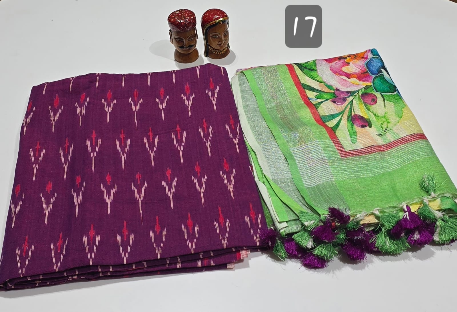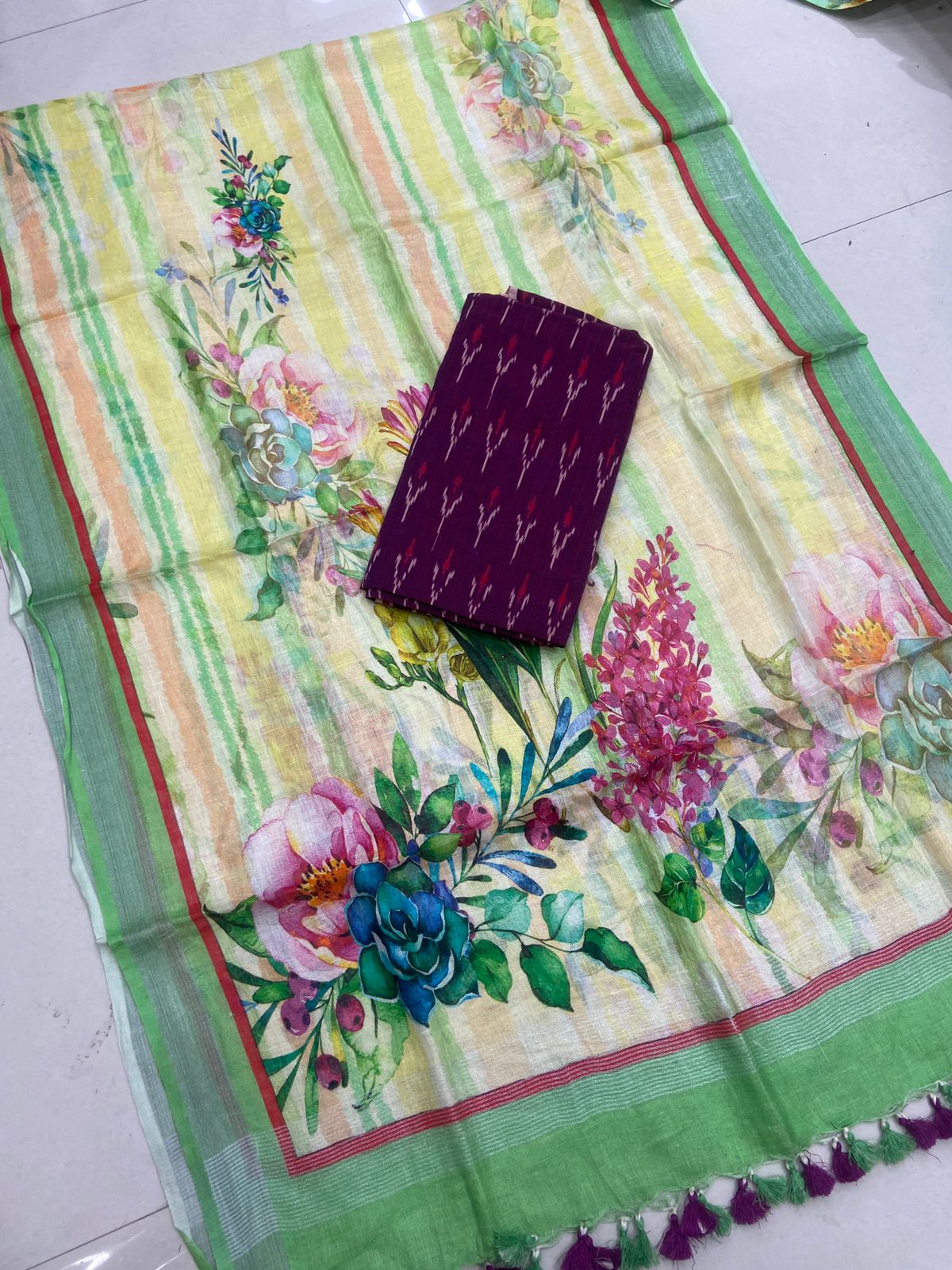 2.5 meters premium quality pure Ikkat cotton top with double side weavings, no bottom, 2.5 meters premium quality pure linen cotton dupatta with silver zari borders and tassels.