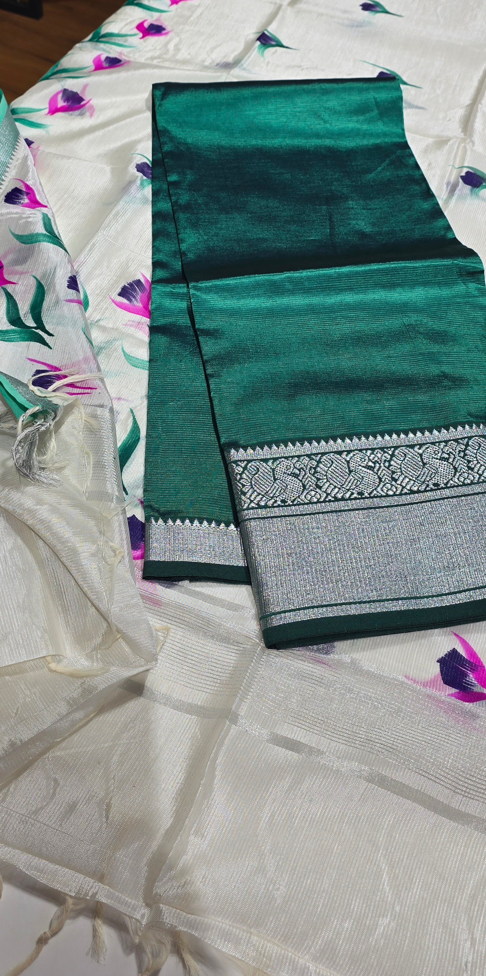 Extremely rich quality 2.5 meters pure Mangalagiri silk top with very rich looking silver or golden zari weaving borders, rich dupion silk bottom, excellent quality 2.5 meters Mangalagiri silk dupatta with nizam silver zari borders with silver zari weaved pallu and tassels.