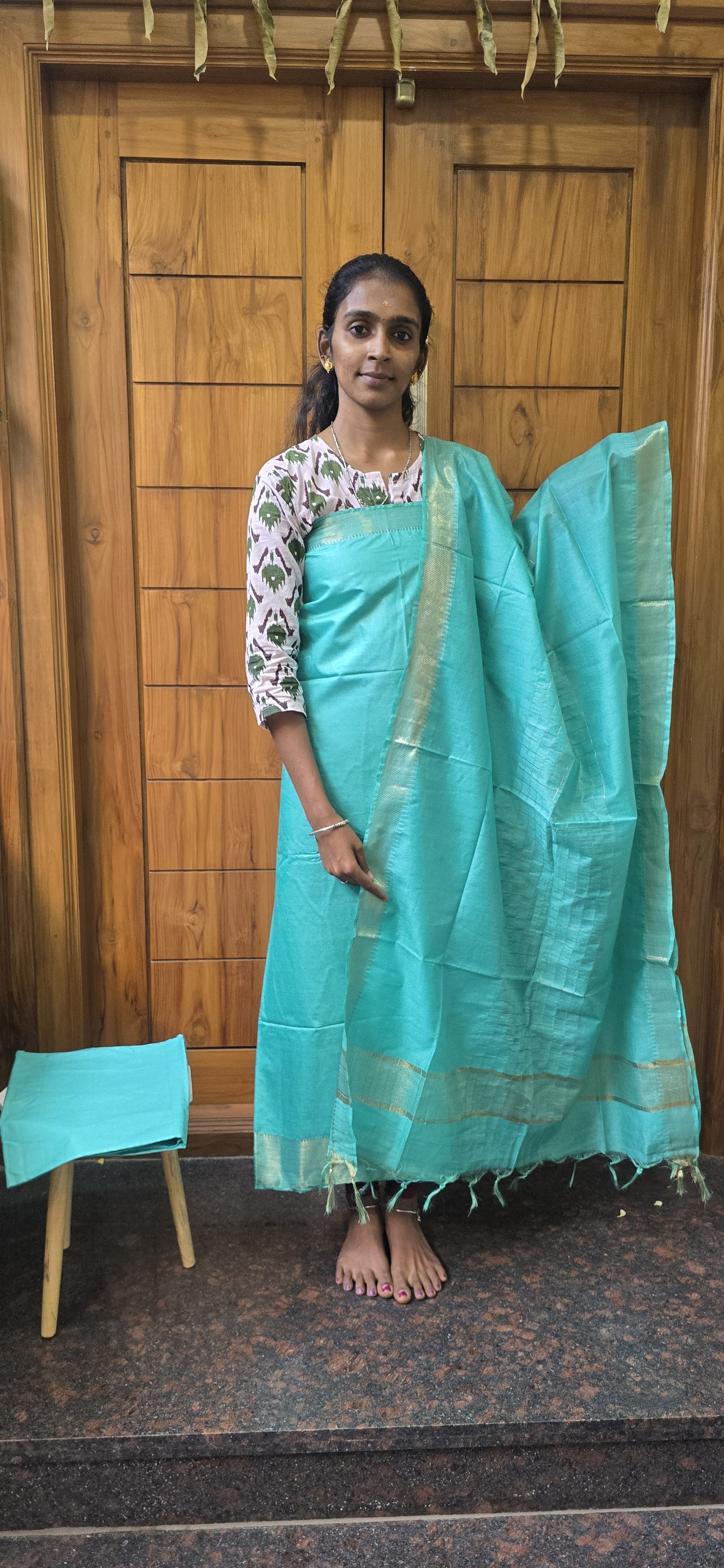2.5 mtrs soft and elegant looking Mangalagiri silk top with either side zari borders, soft Mangalagiri cotton bottom with silk finish, 2.5 meters premium Mangalagiri silk dupatta with zari dupatta with zari borders and tassels.