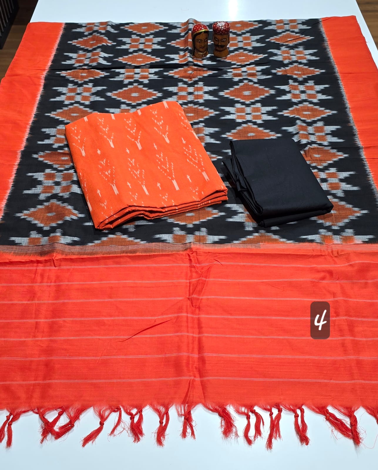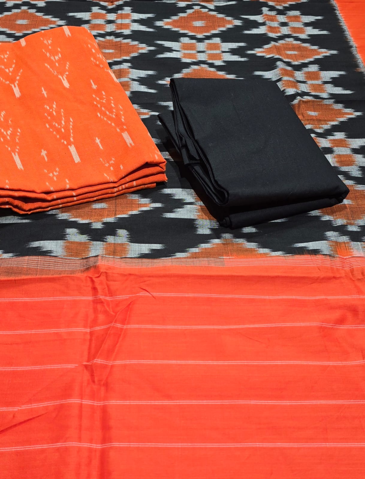 2.5 mtrs premium double side weaved pure Ikkat cotton top, 2 mtr pure cotton bottom, handmade artician worked 2.5 mtrs mercidized pure Ikkat Cotton dupatta with borders and tassels..