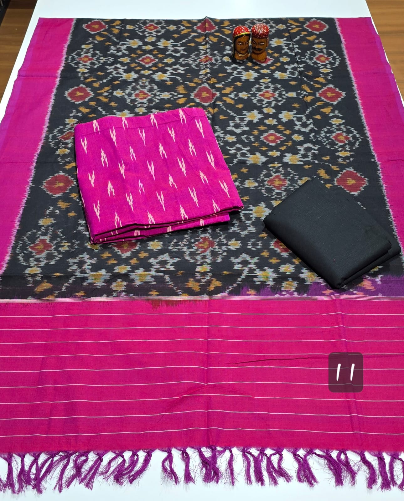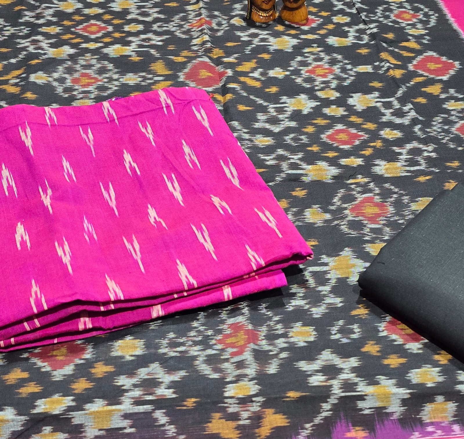 2.5 mtrs premium double side weaved pure Ikkat cotton top, 2 mtr pure cotton bottom, handmade artician worked 2.5 mtrs mercidized pure Ikkat Cotton dupatta with borders and tassels..