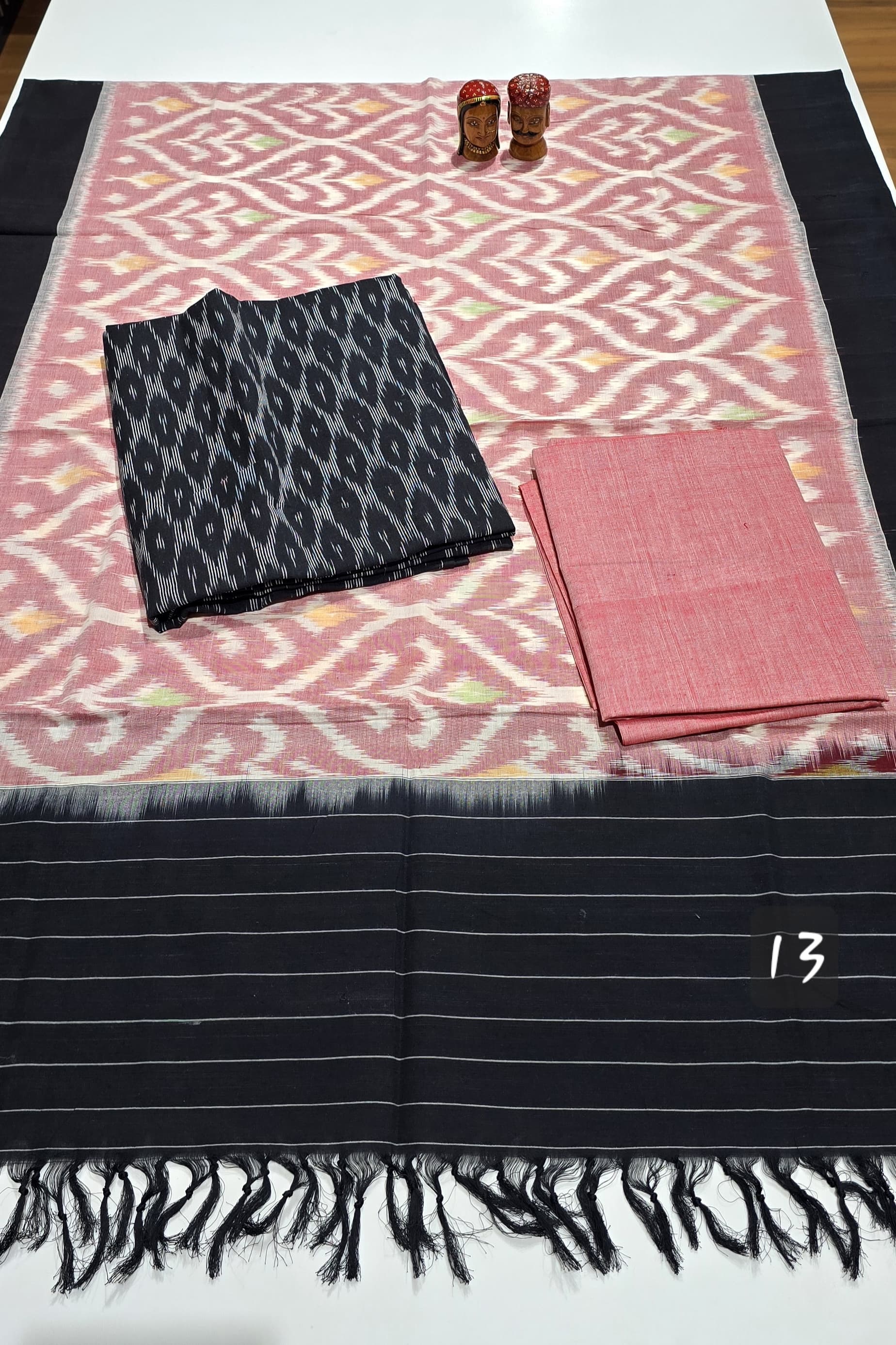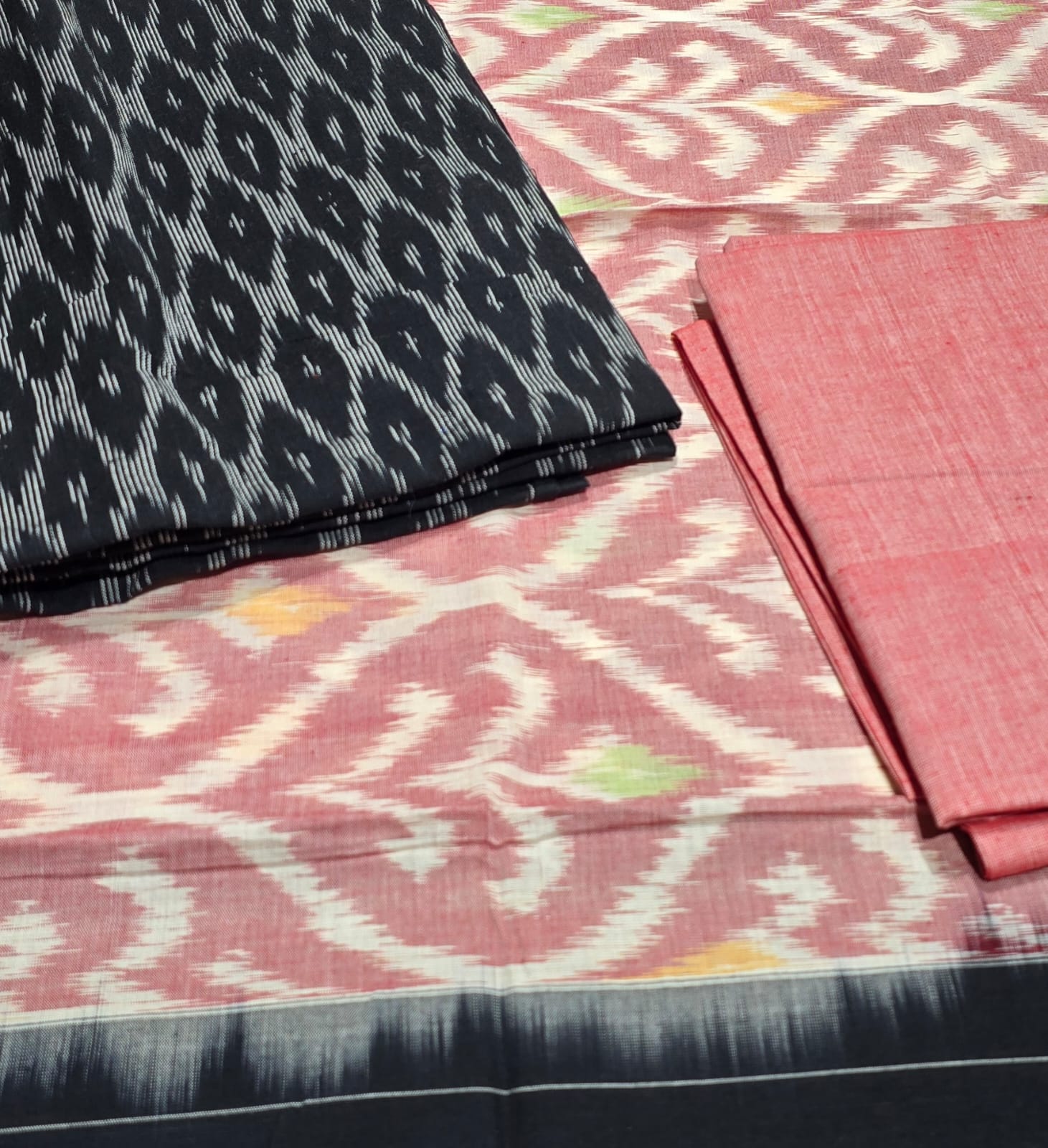 2.5 mtrs premium double side weaved pure Ikkat cotton top, 2 mtr pure cotton bottom, handmade artician worked 2.5 mtrs mercidized pure Ikkat Cotton dupatta with borders and tassels..