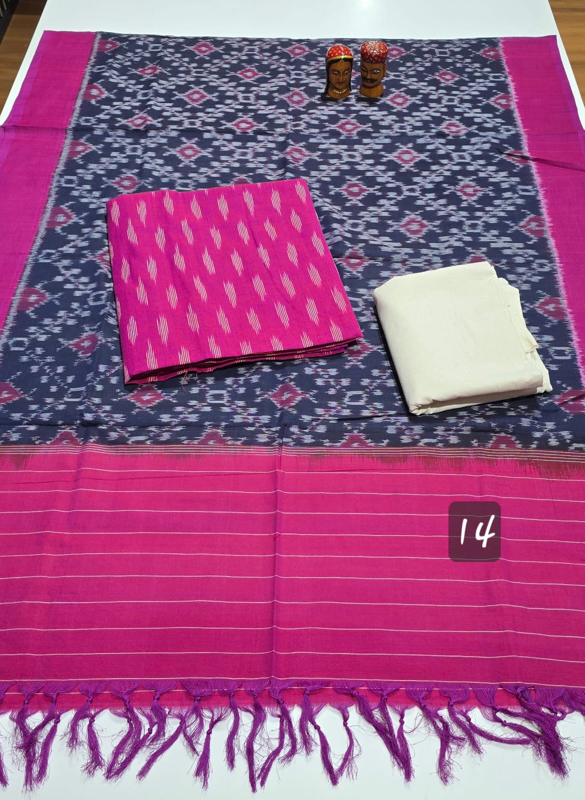 2.5 mtrs premium double side weaved pure Ikkat cotton top, 2 mtr pure cotton bottom, handmade artician worked 2.5 mtrs mercidized pure Ikkat Cotton dupatta with borders and tassels..