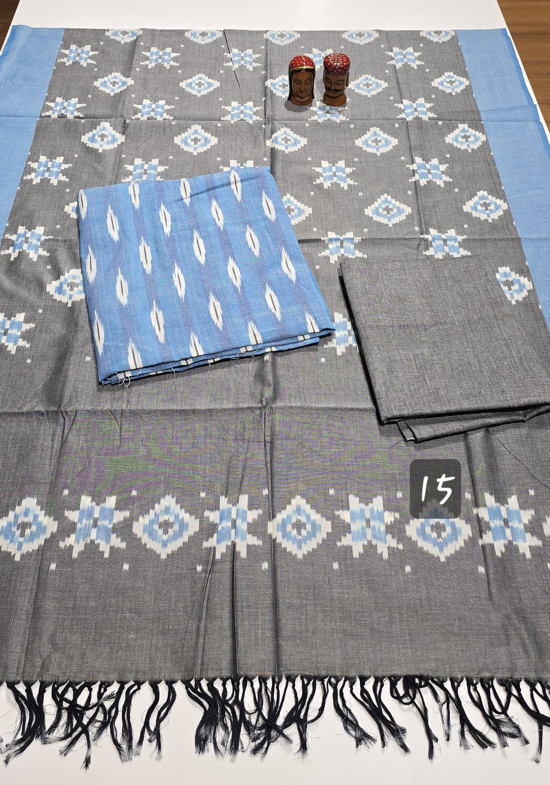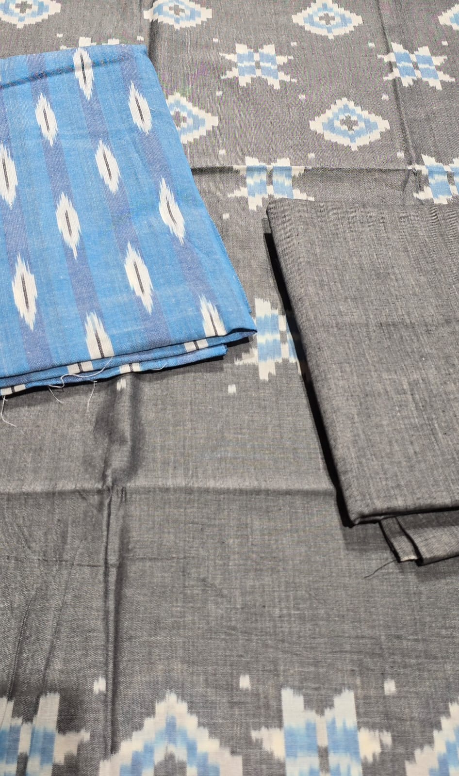 2.5 mtrs premium double side weaved pure Ikkat cotton top, 2 mtr pure cotton bottom, handmade artician worked 2.5 mtrs mercidized pure Ikkat Cotton dupatta with borders and tassels..