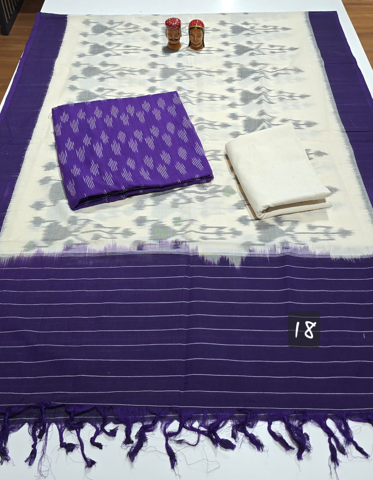 2.5 mtrs premium double side weaved pure Ikkat cotton top, 2 mtr pure cotton bottom, handmade artician worked 2.5 mtrs mercidized pure Ikkat Cotton dupatta with borders and tassels..
