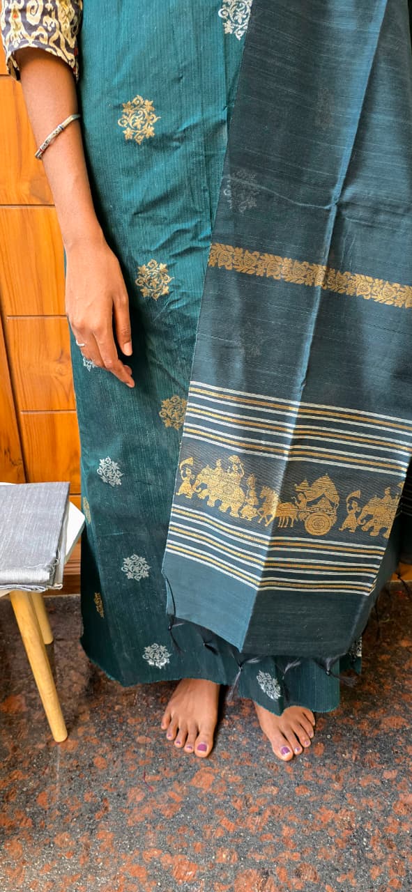 2.5 meters premium quality both side rich zari weaved rich looking raw silk top, premium dupion silk bottom, 2.5 meters most beautiful completely weaved silk dupatta with rich zari borders and tassels.