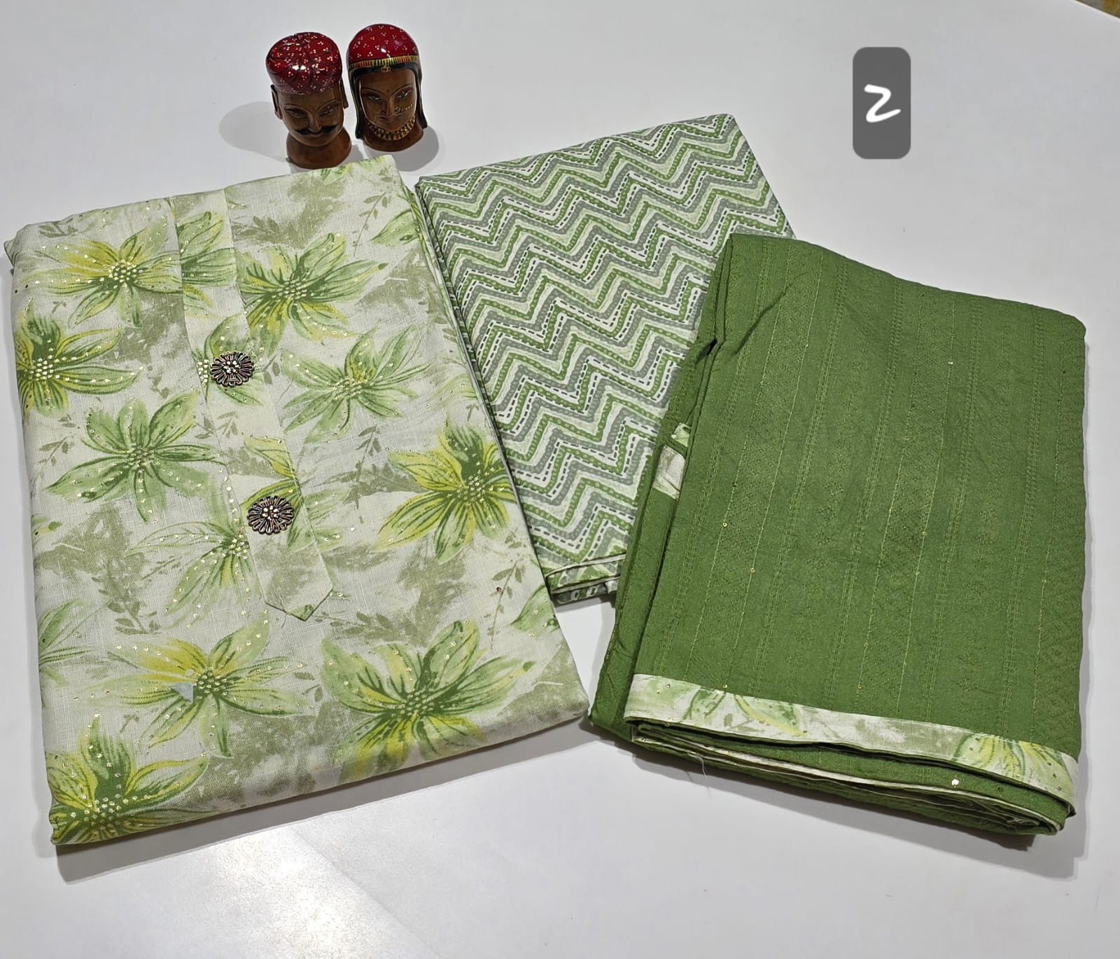 Both side floral printed such a premium quality pure reyon cotton top with rich neck buttons, premium reyon cotton bottom, fully jaccard weaved and sequence worked soft silk dupatta with tapings.
